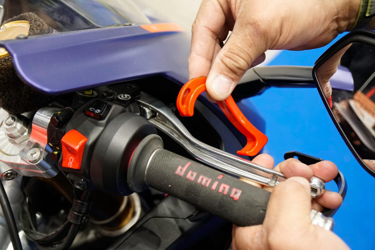 次にフロントブレーキをかけたままの状態にして、車体が不意に動かないようにする。今回は「ブレーキレバーロック」を使用した。価格は660円。