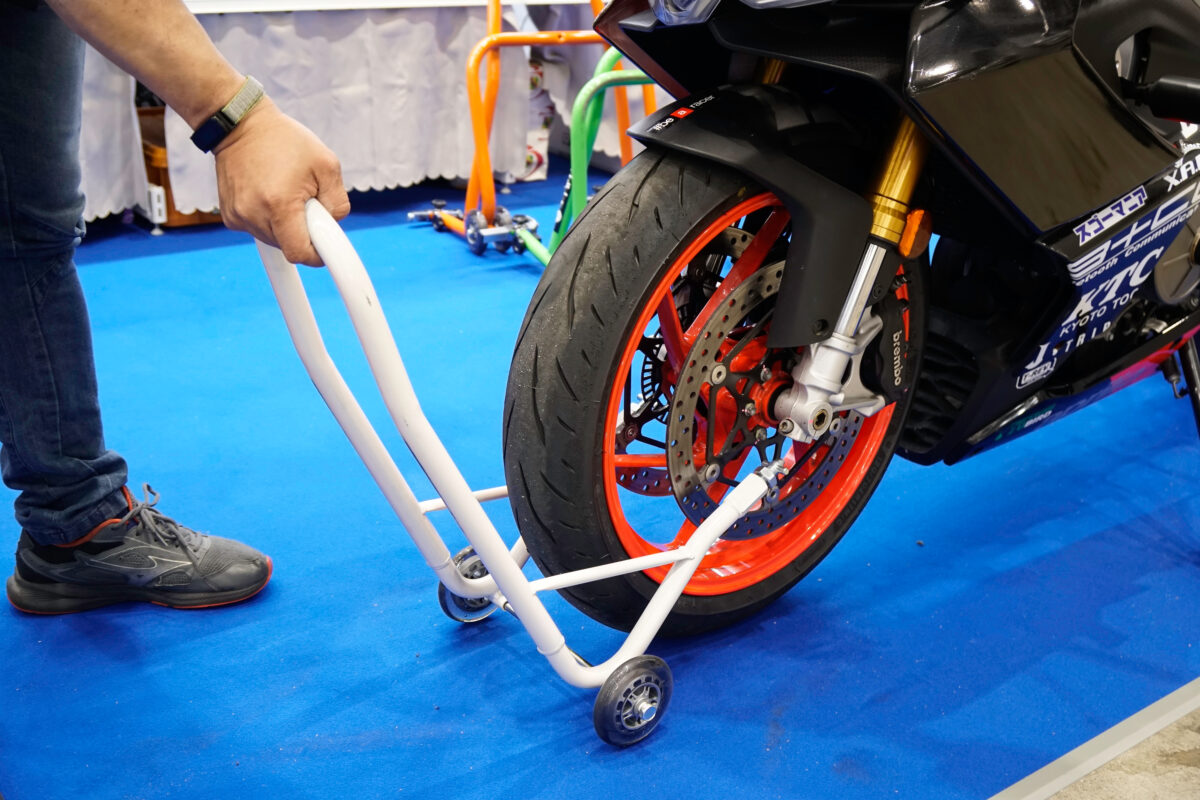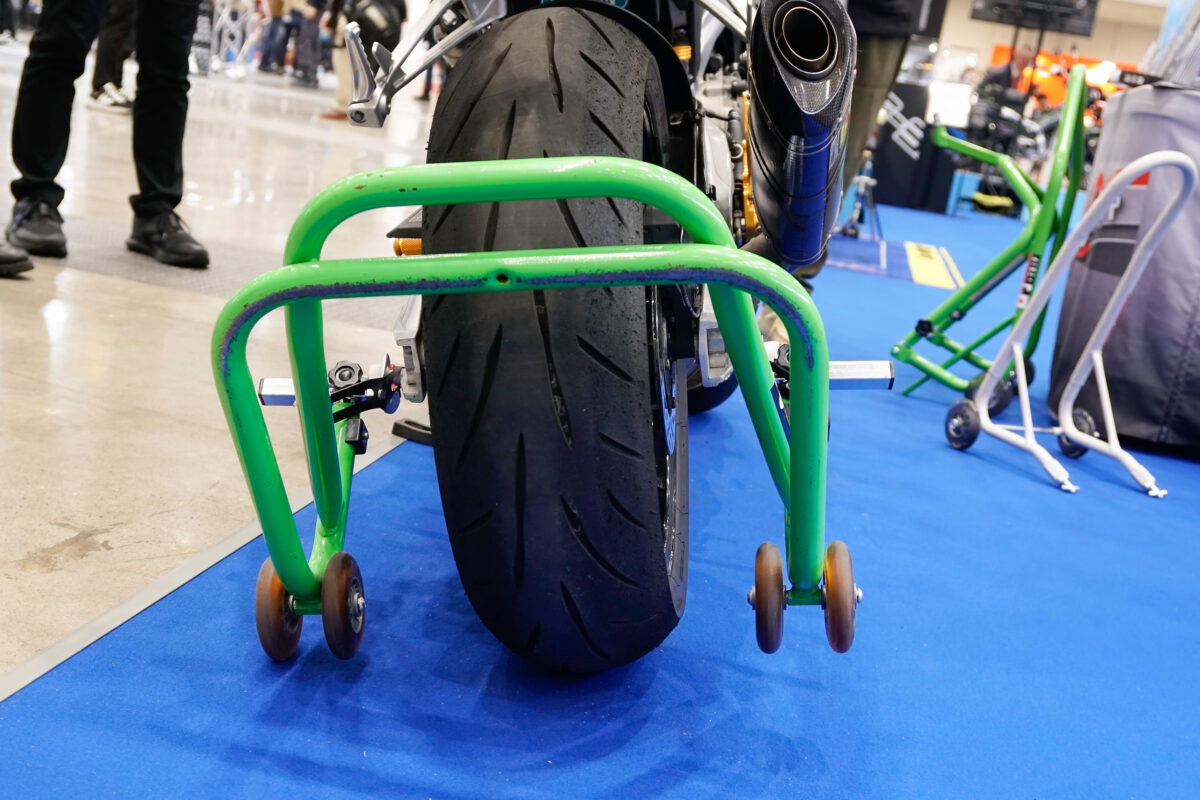 車体の左側、ナンバープレートの横に立ち、車体をゆっくり直立させてスタンドの車輪を両側とも地面に接地させる。スタンド最後部のパイプを軽く踏み込めば、後輪をスッとスタンドアップできる。ホイールの着脱はできないが、ホイール清掃、チェーン調整・注油が大幅にしやすくなる。価格:2万2418円。