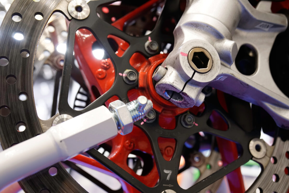 左右のフロントフォーク間の幅と高さに合わせて、フォークスタンドのボルトを調整する。