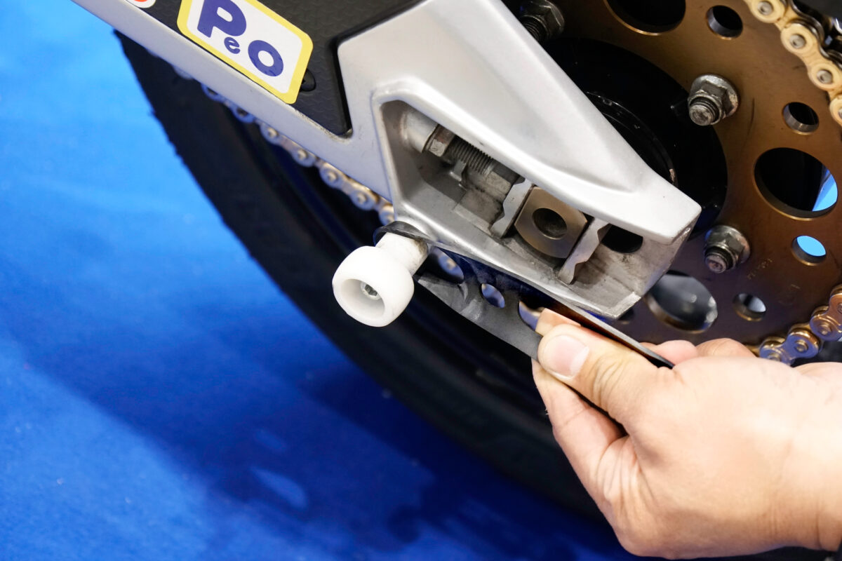 8mm以上の穴が貫通している中空タイプのリヤアクスルシャフトを採用している車両に使用できる。まずはアクスルシャフトとスタンドの穴の位置を合わせて、車体右側からシャフトをしっかり差し込む。車体とスタンドの一体感が増すので、車体のバランスが崩れにくくなる。*片持ちスイングアーム車は不可。