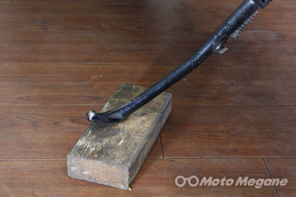 車体をなるべく起こした(正立に近い状態)にするため、サイドスタンド下に木端を入れておく。さらに、ハンドルを左いっぱいに切っておく。こうすることで、万が一車体がバランスを崩してもスタンド側に倒れてくれるので、転倒事故を防ぐことができる。