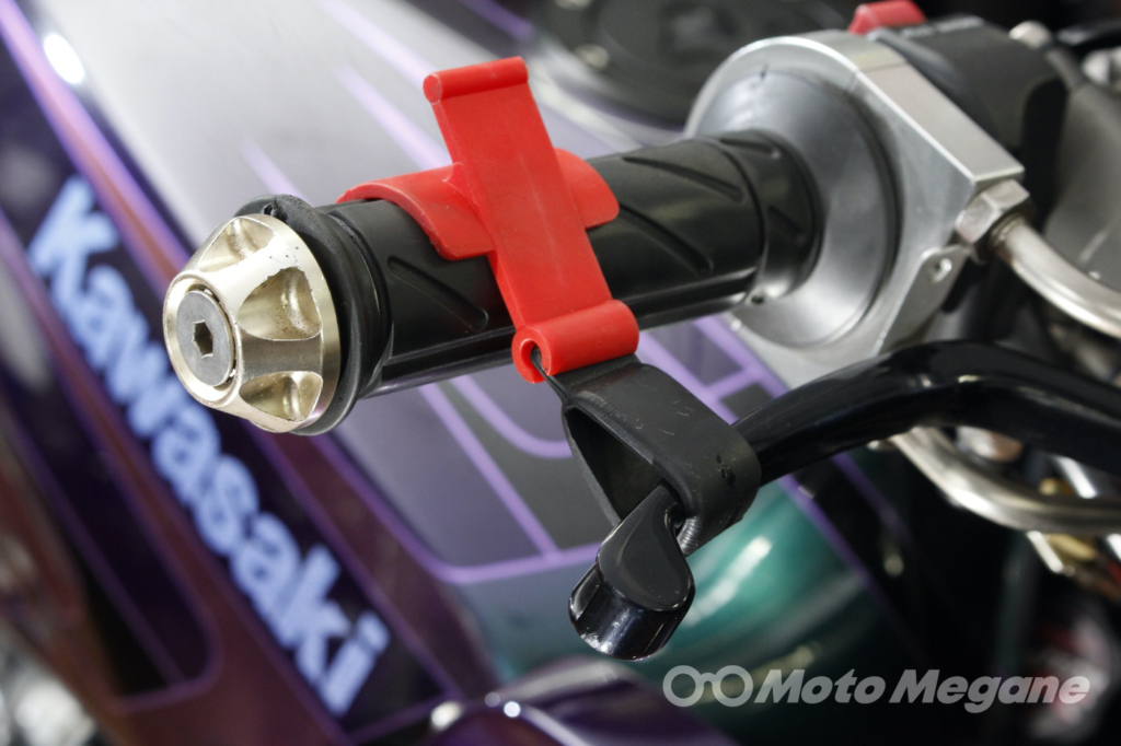 スタンド単体状態で自立させている際に、可動部が倒れないようにゴムバンドが追加されている。また、キャリパーを外した際にスタンドに引っ掛けておけるように、S管も追加されている。