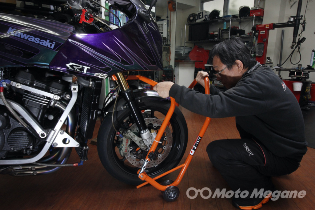 ワンオーナーのフルカスタムニンジャを所有するmc-Kazの上條代表。海外、国内タイヤメーカーでレースサービスを担当。タイヤから足回りを含めたプロフェッショナルである。ショップでは、タイヤの銘柄選びから相談に乗ってもらえるので、タイヤ交換の際はぜひとも同店に相談してみてはいかがだろうか。