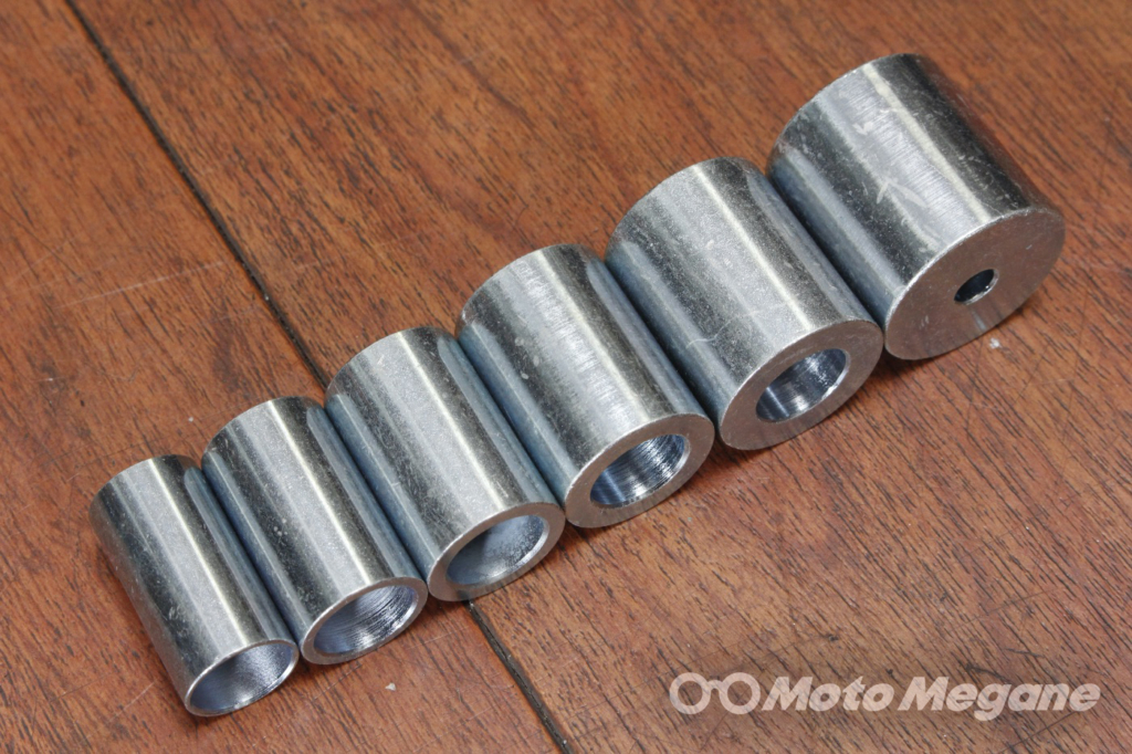 上條さん個人所有のGPz900Rニンジャは、スイングアームにスタンドフックが付いているので、これに合わせてスタンドの受けをV受け(フックタイプ)に変更。スイングアーム幅に合わせて幅の調整を行う。