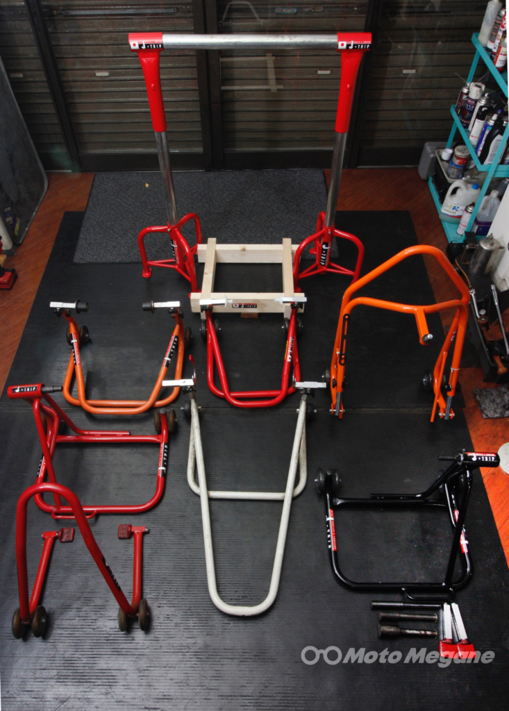 上條さんが普段の業務の中、メンテナンス作業時に使用しているスタンドを含むJ-TRIPの製品群。それぞれに使う人の立場に立ったコンセプトと、日本のモノづくりの技術力が詰まっている。