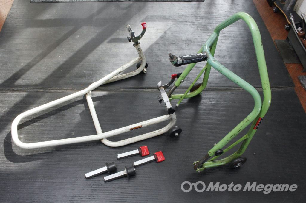 メンテナンススタンドとひと口に言っても、片持ちスイングアーム車や、スイングアーム後端のV字フックで持ち上げるタイプなど、ラインナップは豊富だ。