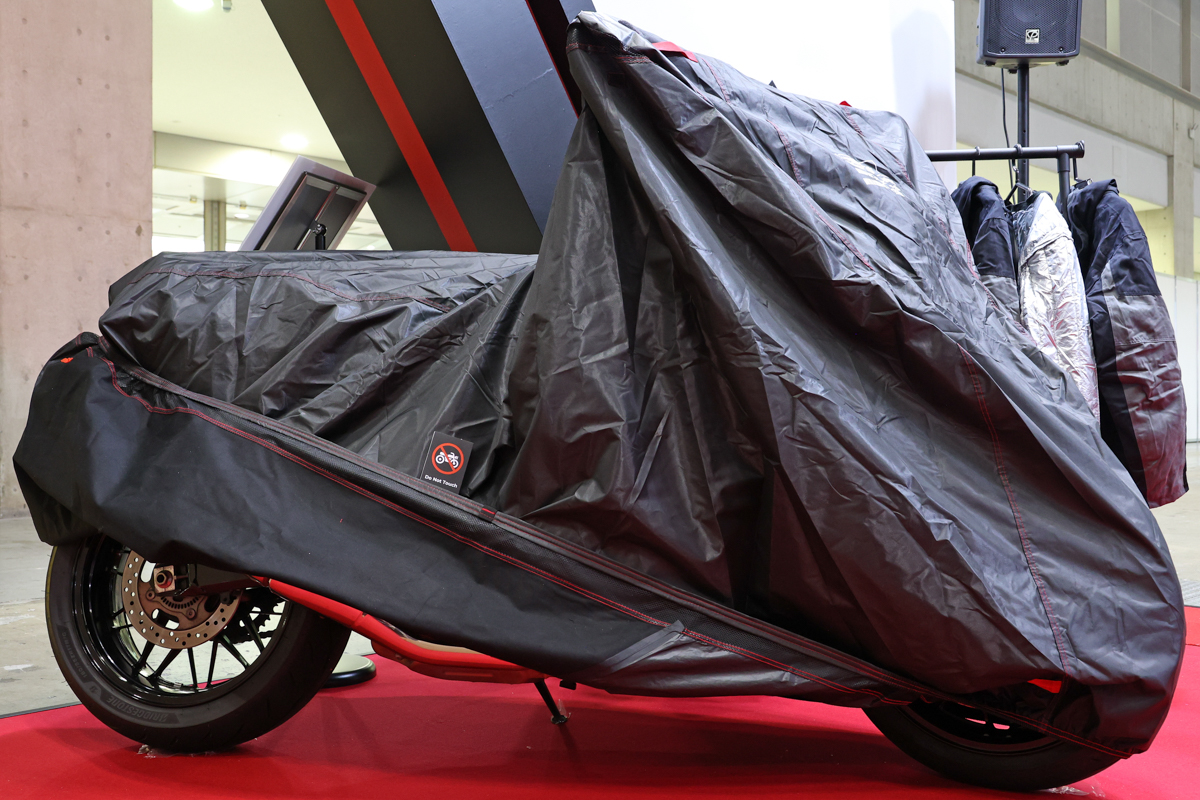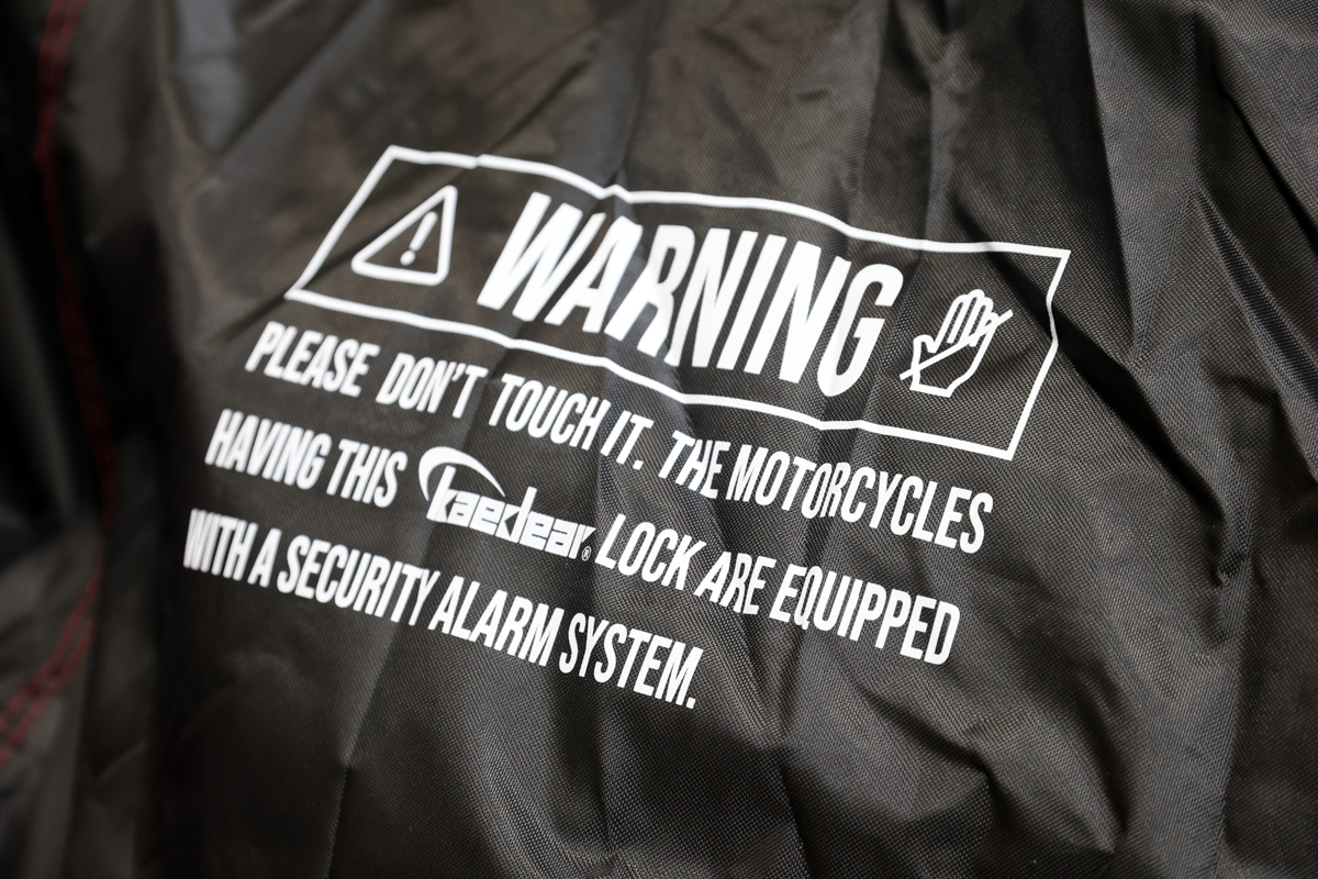 デザイン性・機能性・防犯性を兼ね備えたバイクカバー。表地には厚手で高強度の300Dオックスフォード素材、裏地には柔らかな190Tポリエステル素材を使った2層構造で、マフラー部の裏地にはコットン耐熱生地を採用する。適度な重みがあるため風に飛ばされにくく、太陽光や雨風などから愛車をしっかりガード。耐久性にも優れ、セキュリティ警告文による視覚的威嚇で防犯性も高めている。
