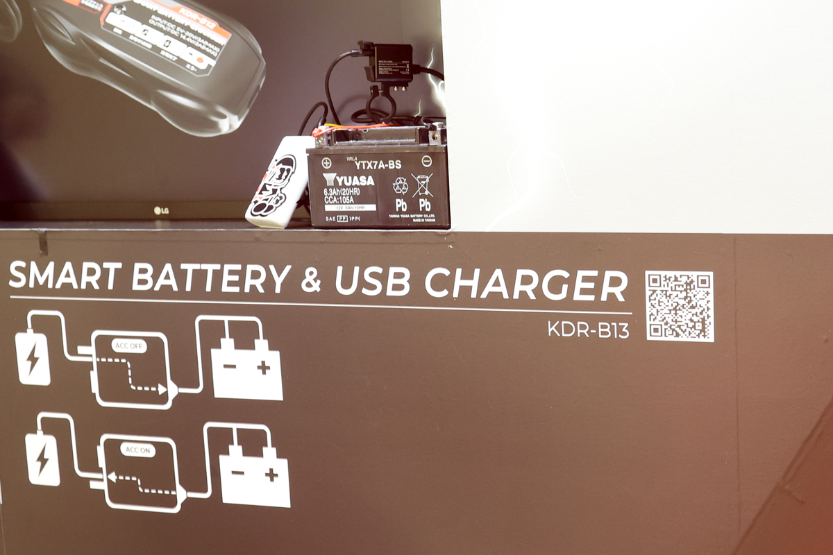 なお製品ラインアップには、ハンドル部に装着し、走行中はUSB電源、駐車中はバッテリー充電器として使用できるKDR-B13もある。USBポートはタイプAとタイプCを搭載。かなり小型化された本体には電圧表示ディスプレイも装備し、車体バッテリーへの充電時にはタイプCポートを使用する。