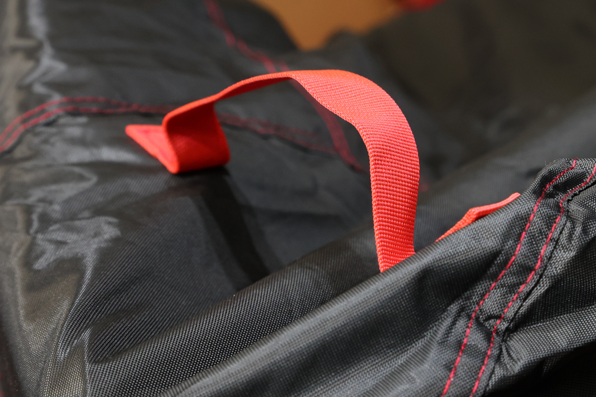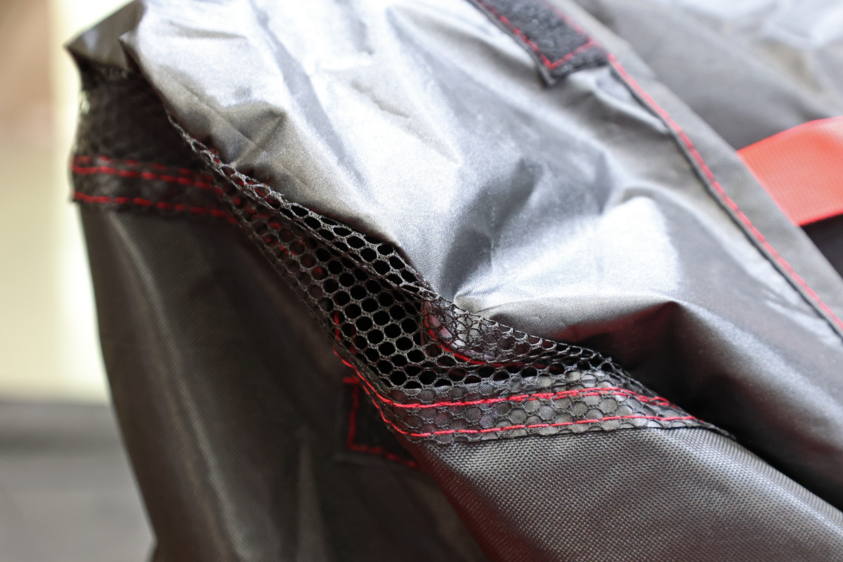 裾には4cmほどのメッシュエリア、左右ミラー位置には耐湿通気ダクトがあり、雨天走行後の蒸れやすい状況でも通気性を確保。表面には撥水加工、縫い目には赤糸の二重縫製、 その裏面にはシームテープ処理が施され、縫い目からの浸水をブロックする。さらに、表地の300D生地が傷んで水が浸入した場合でも、内側の190T生地が雨水をシャットアウトし、裾のメッシュ部分から排出する設計となっている。フロント左右とリア上部に持ち手があり、脱着操作性に優れて前後の目印にもなる点も特徴だ。