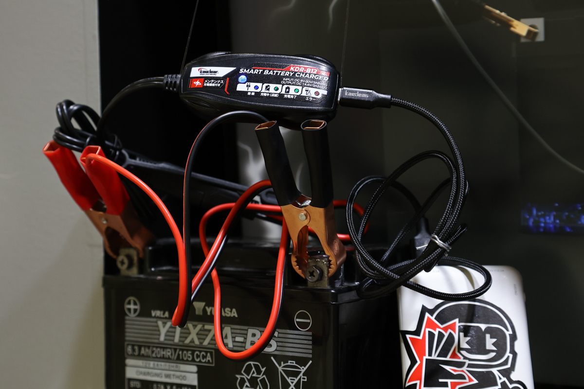 高効率の自動最適化充電機能により、最大2Aの出力(入力電源による制限あり)で、バッテリーの劣化を防ぎながら効率的に充電を実施。充電完了後も、電圧低下を検知すると自動で再充電を開始するメンテナンスモードを搭載している。ワニ口クリップに加え、簡単接続が可能なSAEコネクターも付属。車体側に配線を設置しておけば、SAEコネクターを差すだけで充電を開始できる。