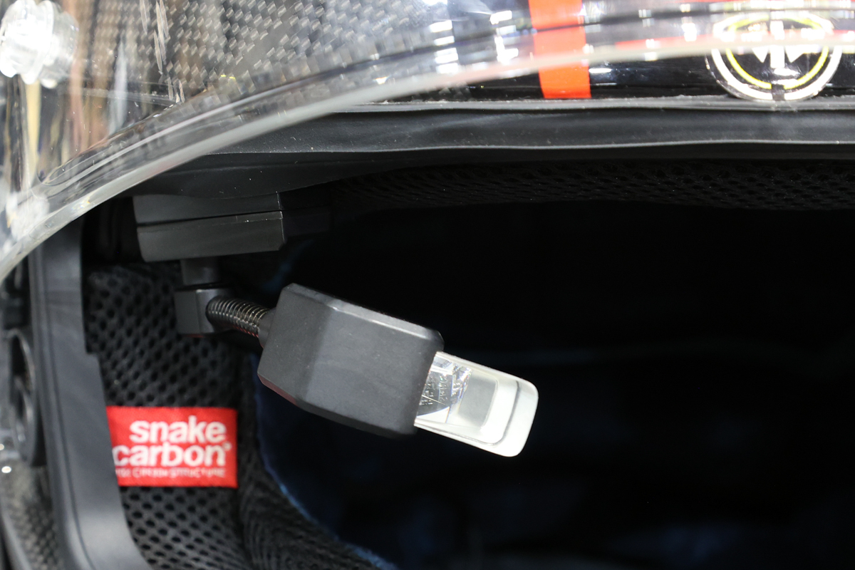 このKDR-BH2は、ヘルメットの右目前あたりに装着する超小型ディスプレイと、後頭部に貼り付ける小型カメラを内蔵した本体、インカム機器などで構成されている。ディスプレイには、バックカメラ―の映像、GPSデータから算出した車速などが表示可能。Apple CarPlayとAndoroid Autoにも対応しており、これを活用することでナビ画面も表示できる。