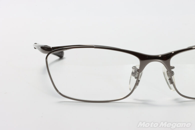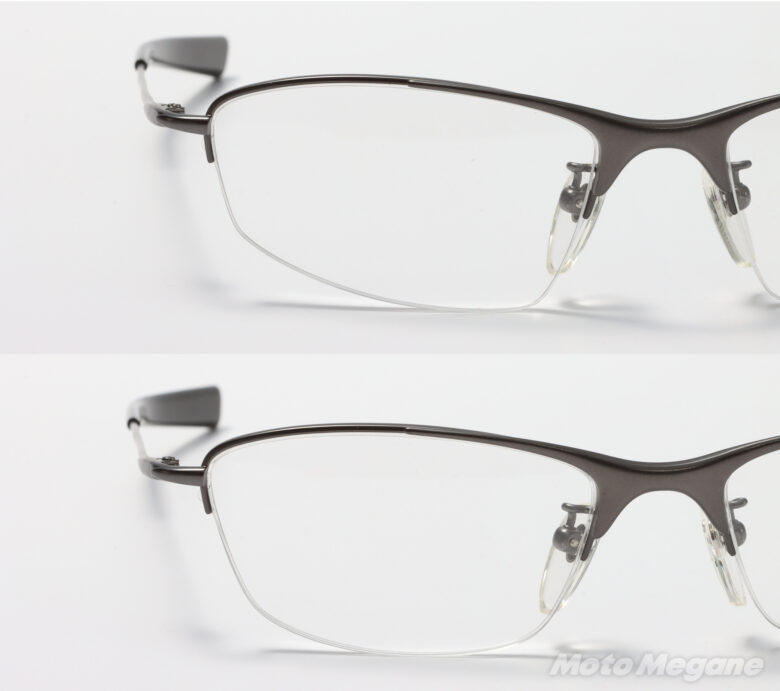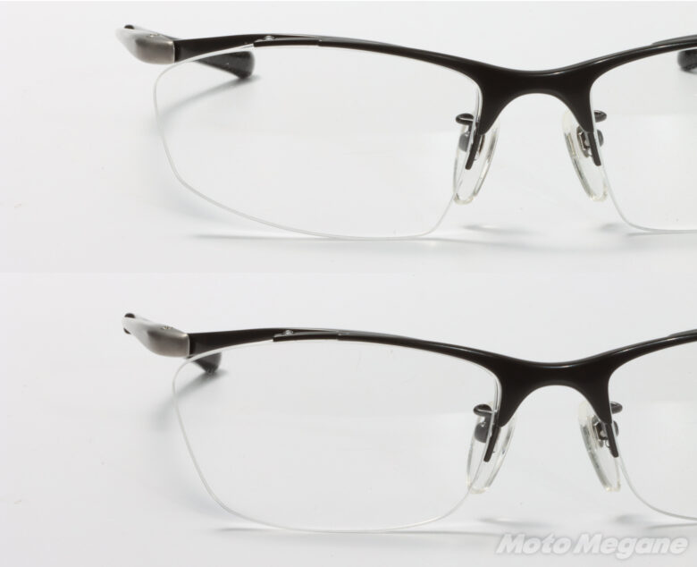 タイトなフルフェイスヘルメットを被った状態で顔との隙間にメガネを差し入れるように押し込んでいくと、メガネフレームが歪んでしまうのではないかと不安に思うものだ。