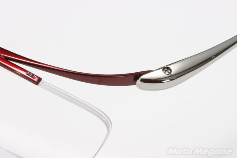 2種類のチタニウムを素材とすることで、ソフトなかけ心地とヘルメットにメガネを差し込む時の剛性感を両立させた「ツインチタニウム」。