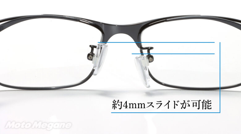 ライディングポジションが前傾になるとレンズと目線が位置が変わり、フレーム上部が視界に入ってきてしまうため、顎を上げた不自然な姿勢になりがちだ。オプションのスライドパッドを装着することで約4mmのメガネの位置を上げることができ、前傾ポジションでも顎が上がらず理想的なライディングポジションを維持することができる。
