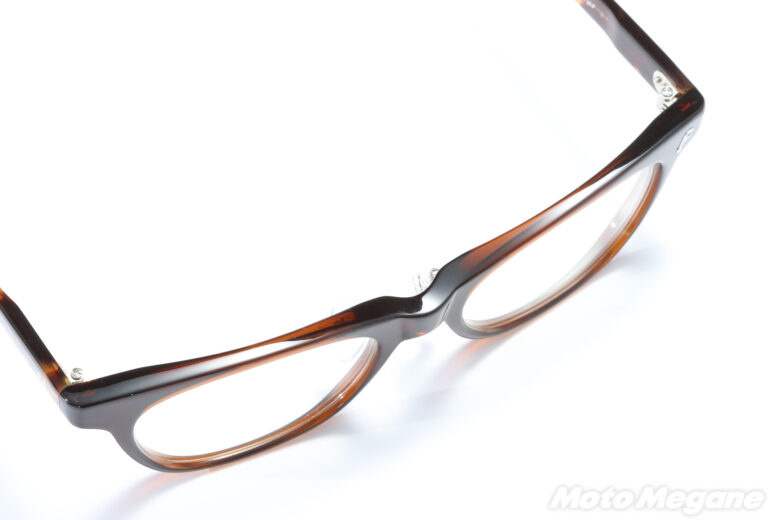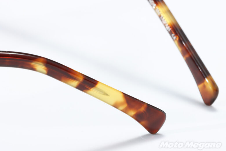 アセテート(プラスチックフレーム)の弱点である重量の軽減に成功したフレームはフォルムやカラーもおしゃれで、バイクとコーディネイトしたいという人はもちろん、普段のカジュアルと合わせてもスタイリッシュに決めることができる。