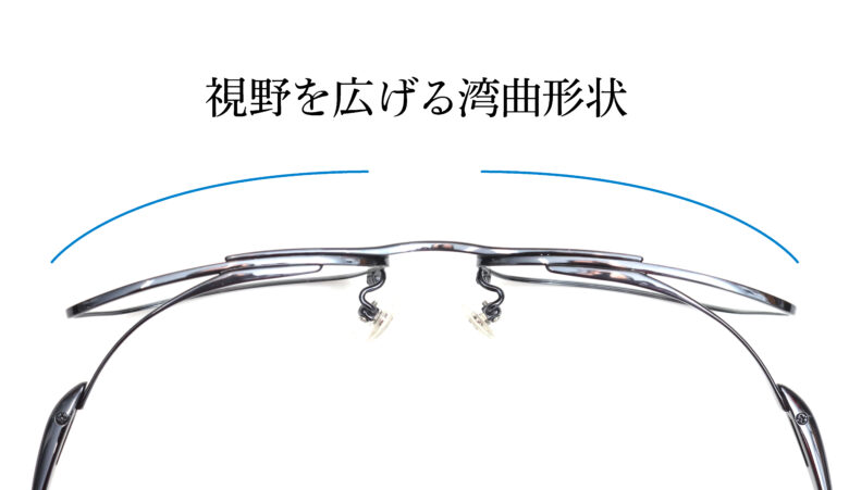 上から見ると顔のラインに沿った形状で、側方に目線を移した際もフレームが視界に入らないのが特徴だ。