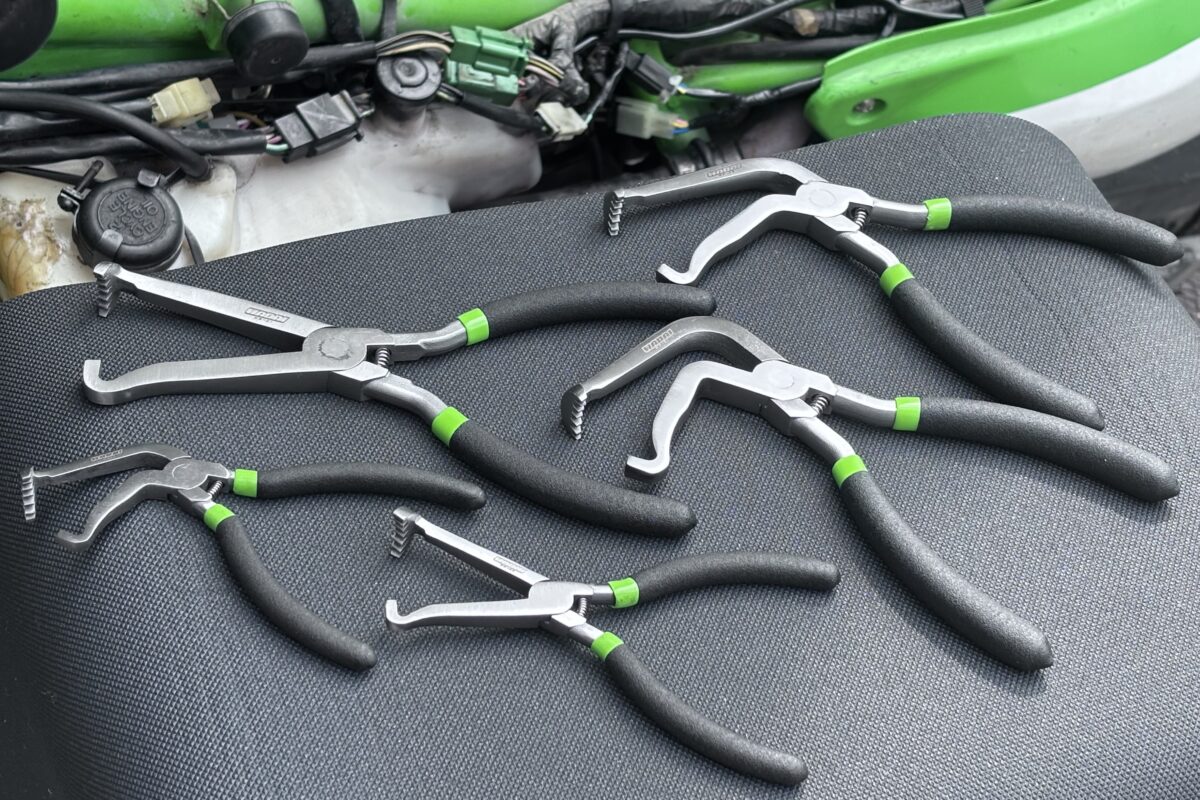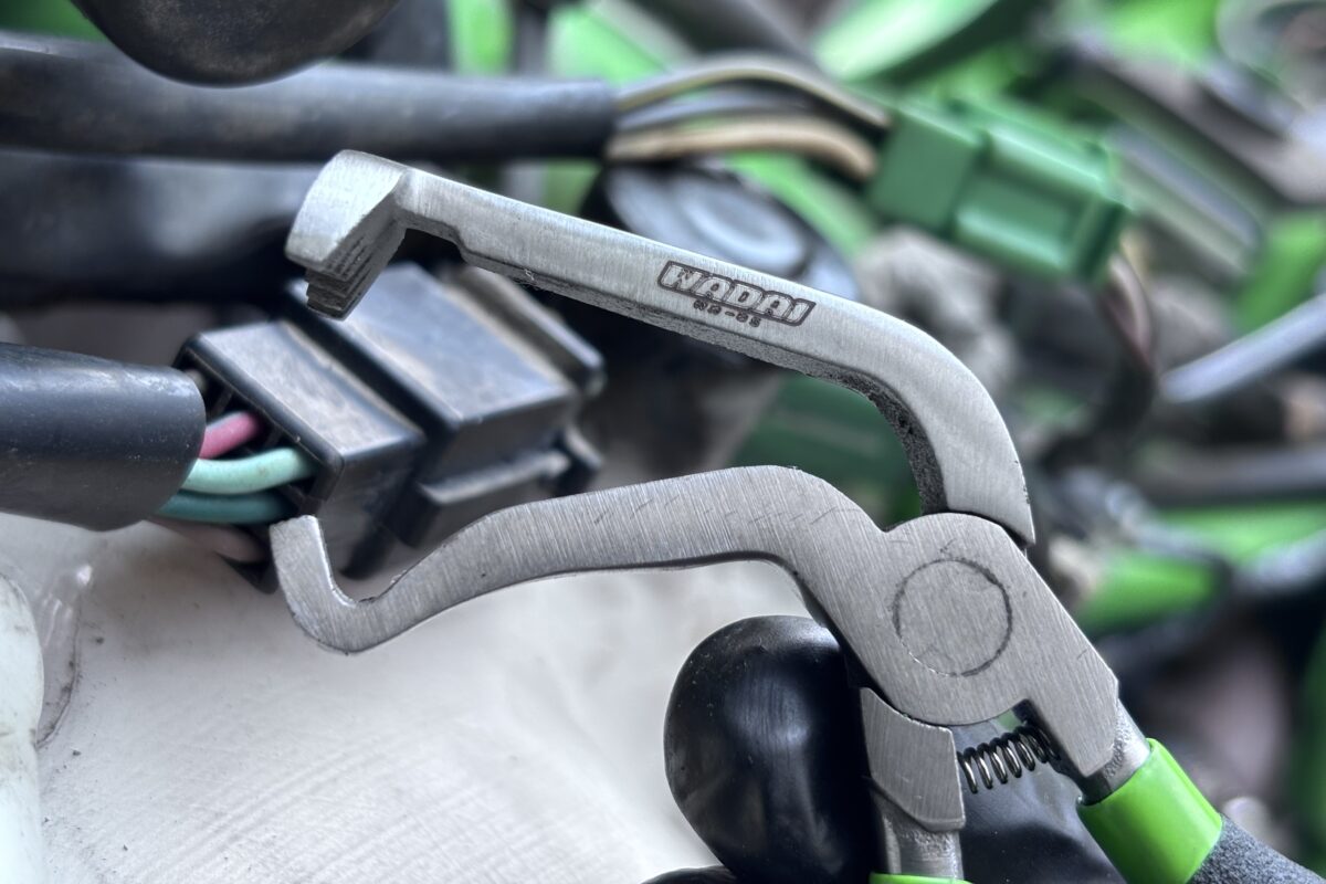 バイク、とくにギッチギチに配線が組み込まれた最新モデルは、フレームの奥まった位置に押し込まれていたり、指が入らない角度で固定されていたり、ラジエターやエアクリーナーボックスの裏に隠れていたりと、“外すこと考慮していないだろ!”と文句を言いたくなるカプラー構造が増えている。