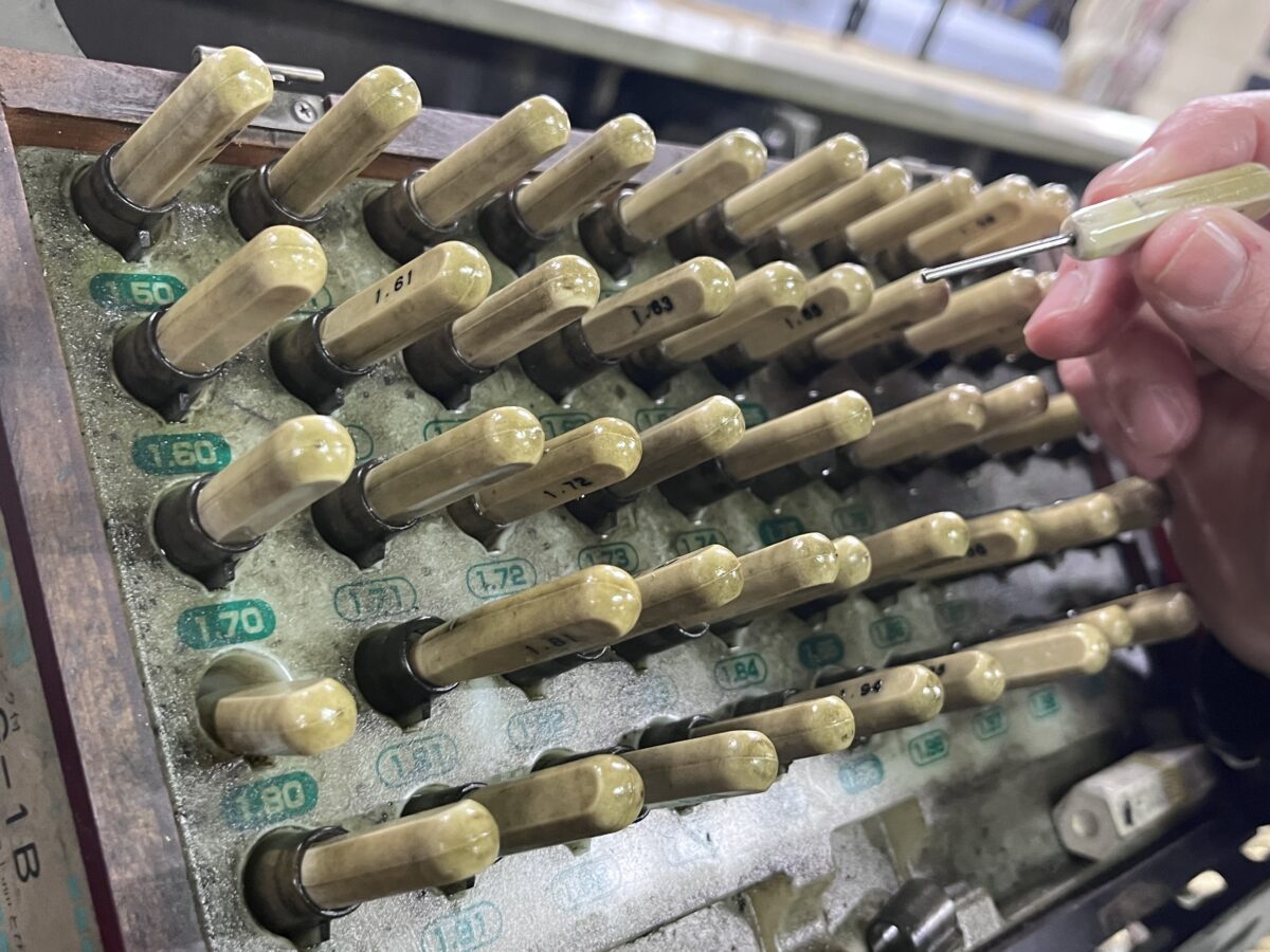 藤原:「ピンゲージや治具を使って、製造したジェットの穴径やサイズを細かくチェックしています。最初、中間、最後の製品を確認し、すべて同じ精度で作られているかを確認するんです。ただ、公差(許容範囲の誤差)から外れるパーツはほとんど出ませんね。」