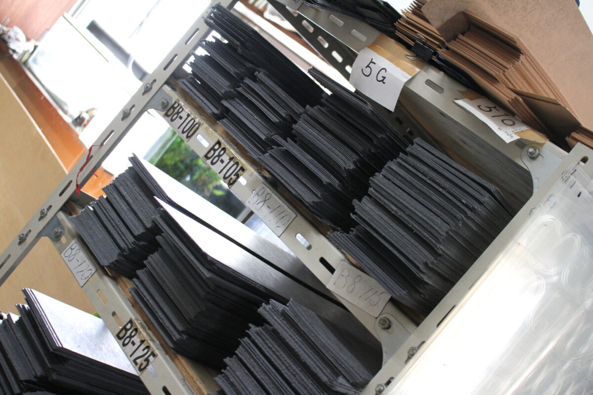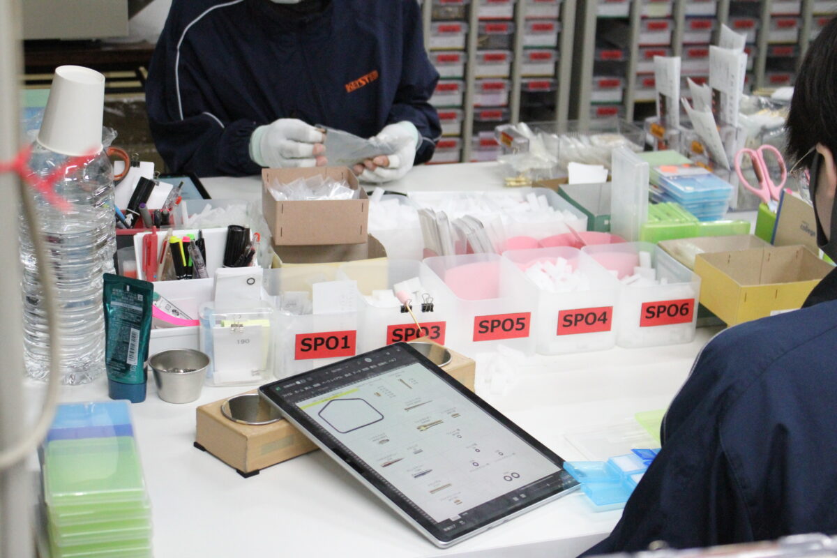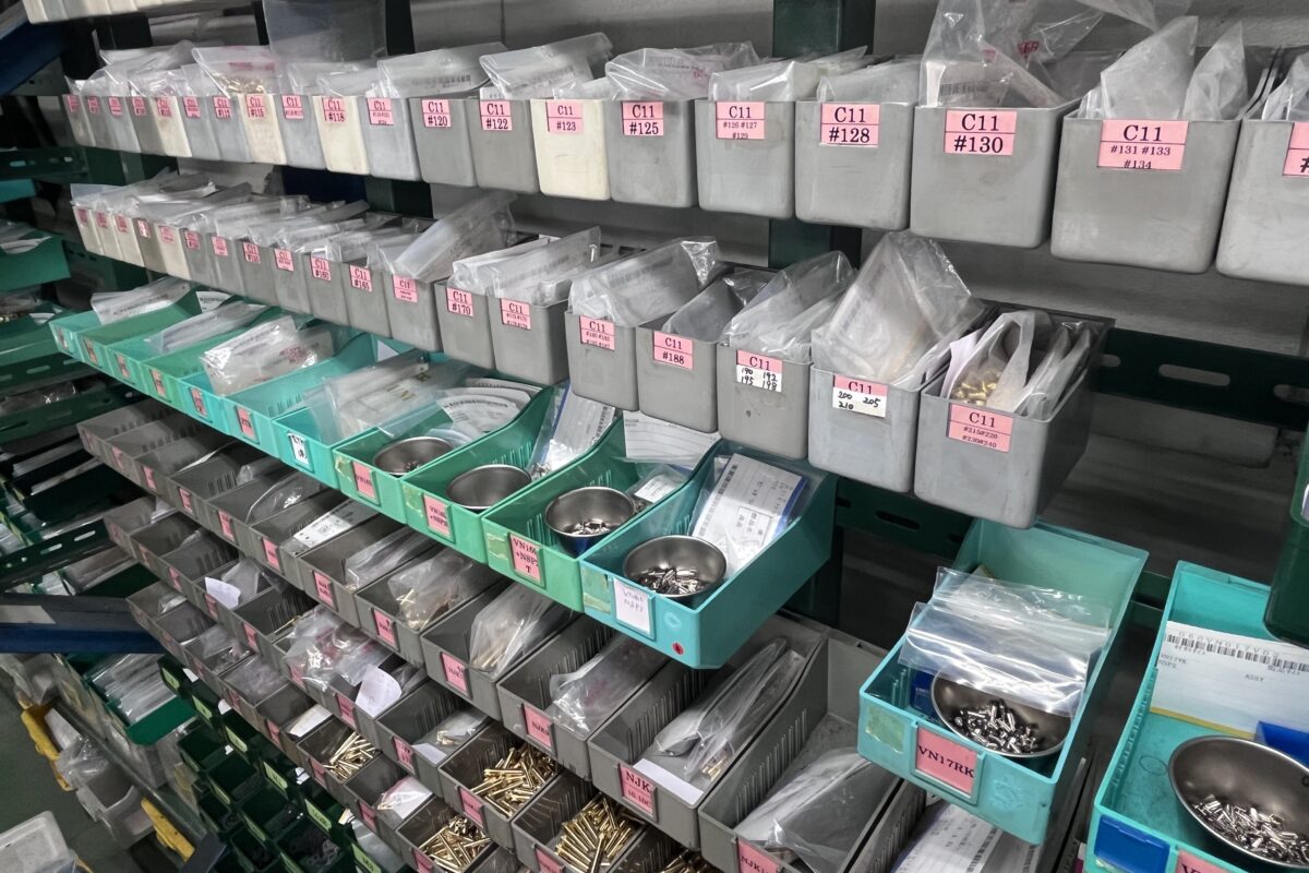 最後の行程として、真鍮パーツ、ゴムパーツなどを1ヶ所に集め、出荷指示のあったものを集める(ピックアップ)作業をピッキングという。