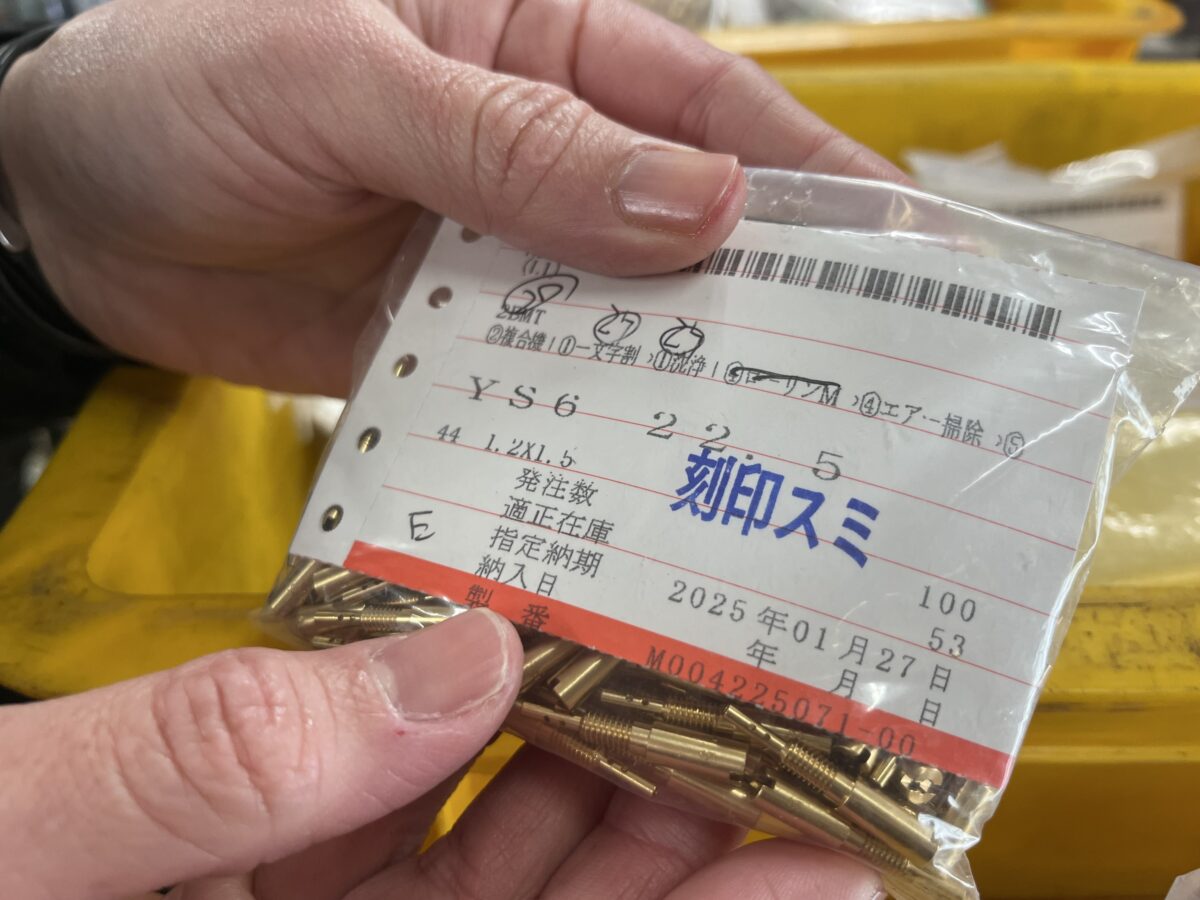 メインジェットなどの金属パーツは採寸を行なったのちNC旋盤でプログラミングして、まったく同じパーツを数百、数千個と削り出す。