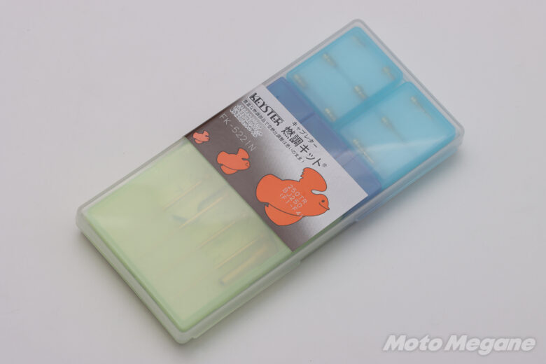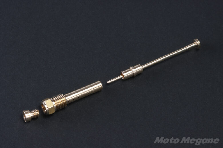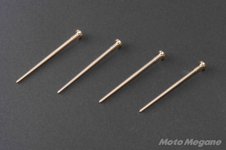 ジェットニードルはストレート径やテーパー角度の異なるものを使い分けることでセッティングを行うことができる。燃調キットには4本付属している。