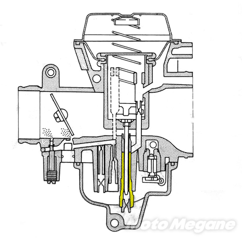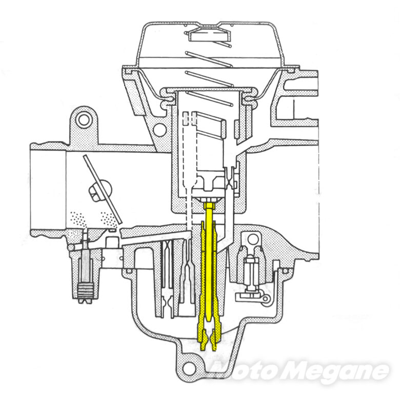 ジェットニードルはバキュームピストン(ピストンバルブ)の上下動に連動して、メイン系統の燃料を計量している。