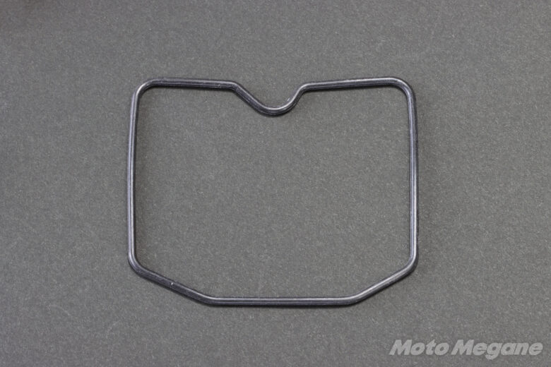 ジェット類を交換すればキャブレター性能は蘇るのだが、オーバーホール時に欠かせないのがOリングやパッキン類の消耗品だ。フロートチャンバーの合わせ面のガスケットが経年劣化で潰れてしまうと、ガソリンが滲んで漏れてしまう。