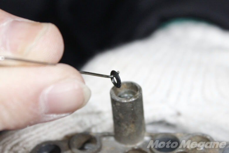 例えばパイロットジェットのOリングが切れたり、痩せてしまい機能を果たさなくなると、隙間から空気を吸ってしまい、これが低速時の不調を招く。