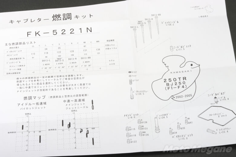 車種専用でキャブレターのオーバーホールやセッティングに必要なジェット類と補修パーツをオールインワンのセットにした「燃調キット」。