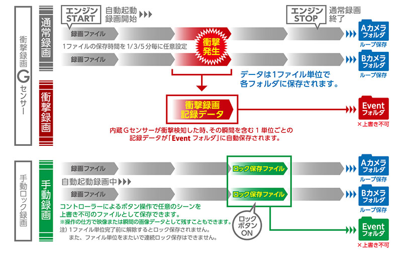 対して衝撃録画とは、自動的にEventフォルダへ保存され、上書きされることはない