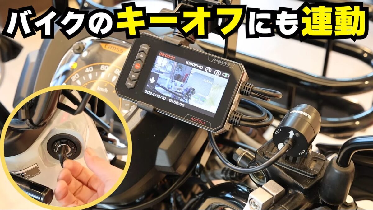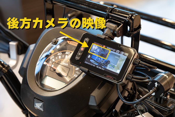 AD731JはバイクのメインキーON/OFFと連動して録画が開始/終了するため特別な操作は必要ナシ。見やすいモニターでライブ映像で画角を確認できるため、画角の調整も容易だ。