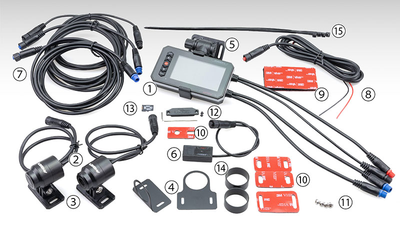⑦各種延長ケーブルx3 ⑧電源ケ-ブルx1 ⑨面ファスナーテープx1 ⑩両面テープx4 ⑪タッピングビス x4 ⑫防水カバーx1set ⑬micro SDカード(動作確認用)x1 ⑭カメラカラーx2 ⑮結束バンドx4