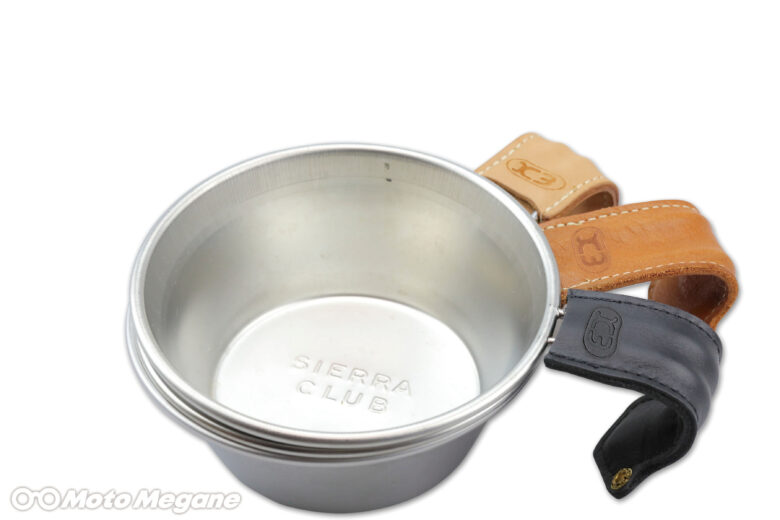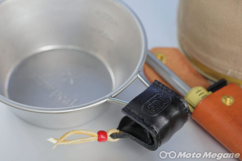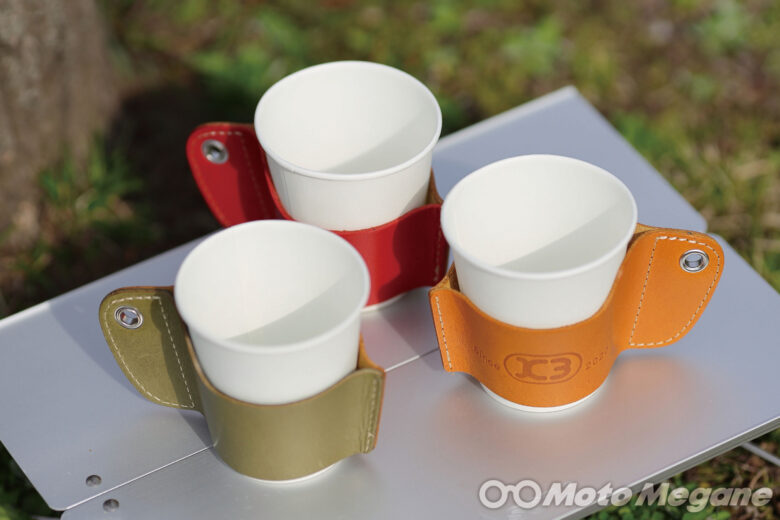 ツーリング先やキャンプでの熱々コーヒーを楽しむ! 本革製のカップホルダーを装着すれば、持ち手に伝わる熱さを抑えるだけでなくお洒落なブレイクタイムに!