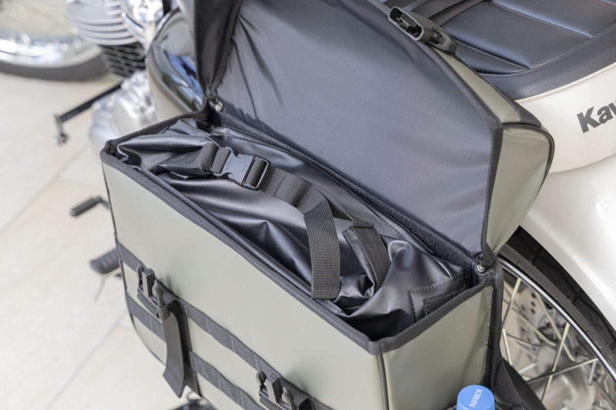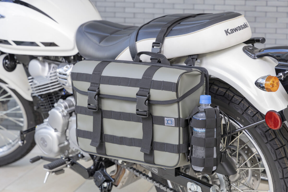 ところが現在日本に流通している完全防水を謳ったターポリン素材のバッグは、実用性は高いがデザインが味気なく、内容量が少ないと型崩れするものが目立つ。また黒、黄色、赤といったカラー展開が多いのも特徴。アドベンチャーモデルならこういった製品でも似合うが、たとえばホンダ・レブルやGB350、ロイヤルエンフィールド、トライアンフ、ハーレーダビッドソンと言ったクラシカルやスタンダードなモデルには、到底しっくりこない。