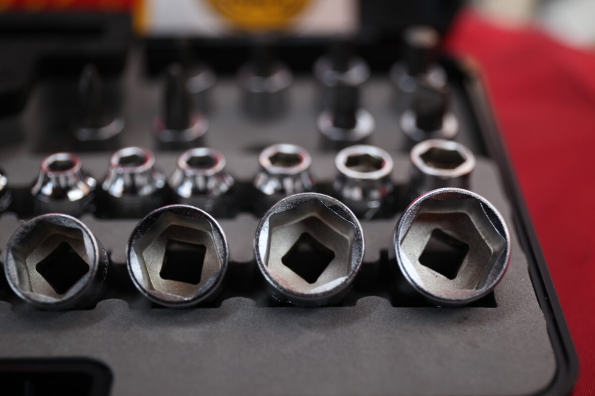 ユニバーサルジョイントもあれば便利なアイテム。角度を変えられるので、斜めになってしまうのを防いでくれる。ただ、少し使い方が雑になると失敗につながるので、注意は必要かもしれない。ソケットは六角ボルトなら「六角のソケットがオススメ。花と呼ばれる多角ソケットは強い力に耐えにくく、失敗の確率が高まりますね」と林さん。ボルトにハメやすいのでビギナーで使いがちなソケットだが、総合的に考えると六角のソケットが最適となる。