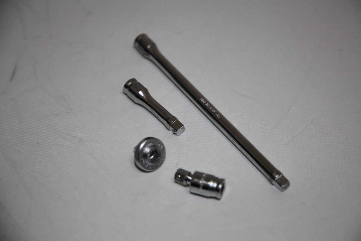 ラチェットレンチは本体にさまざまなソケットを装着させて多様なボルトやネジに対応する。しかし、それだけだと使いにくかったり、使えない部分が出てくるので、アシストするアイテムが存在する。その筆頭となるのがエクステンションバーだと林さんは言う。ボルトとラチェットの間を長くしてくれるのだが「ラチェットが引っかかる部分を回避できますし、力の入れやすい体勢で作業ができる」というのがメリット。実は作業には姿勢や体勢も重要ポイントのひとつ。力を入れやすい体勢で作業すれば、コントロールもしやすいのだ。