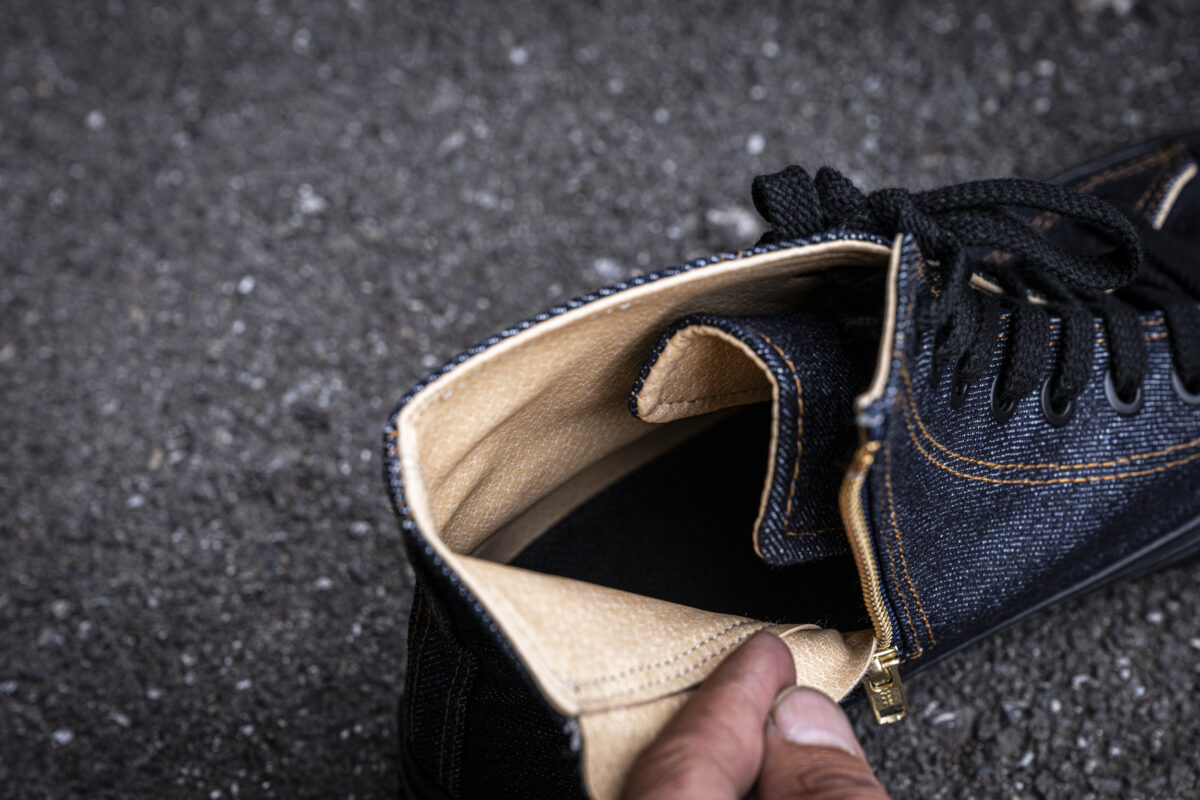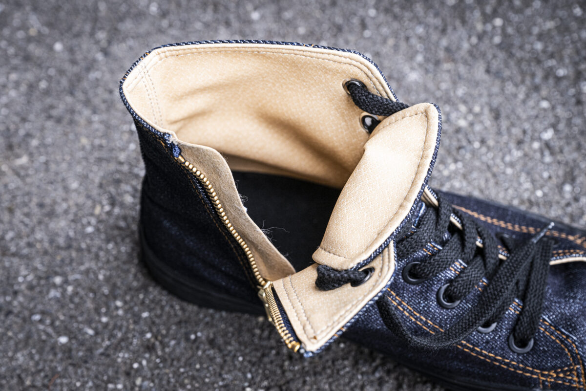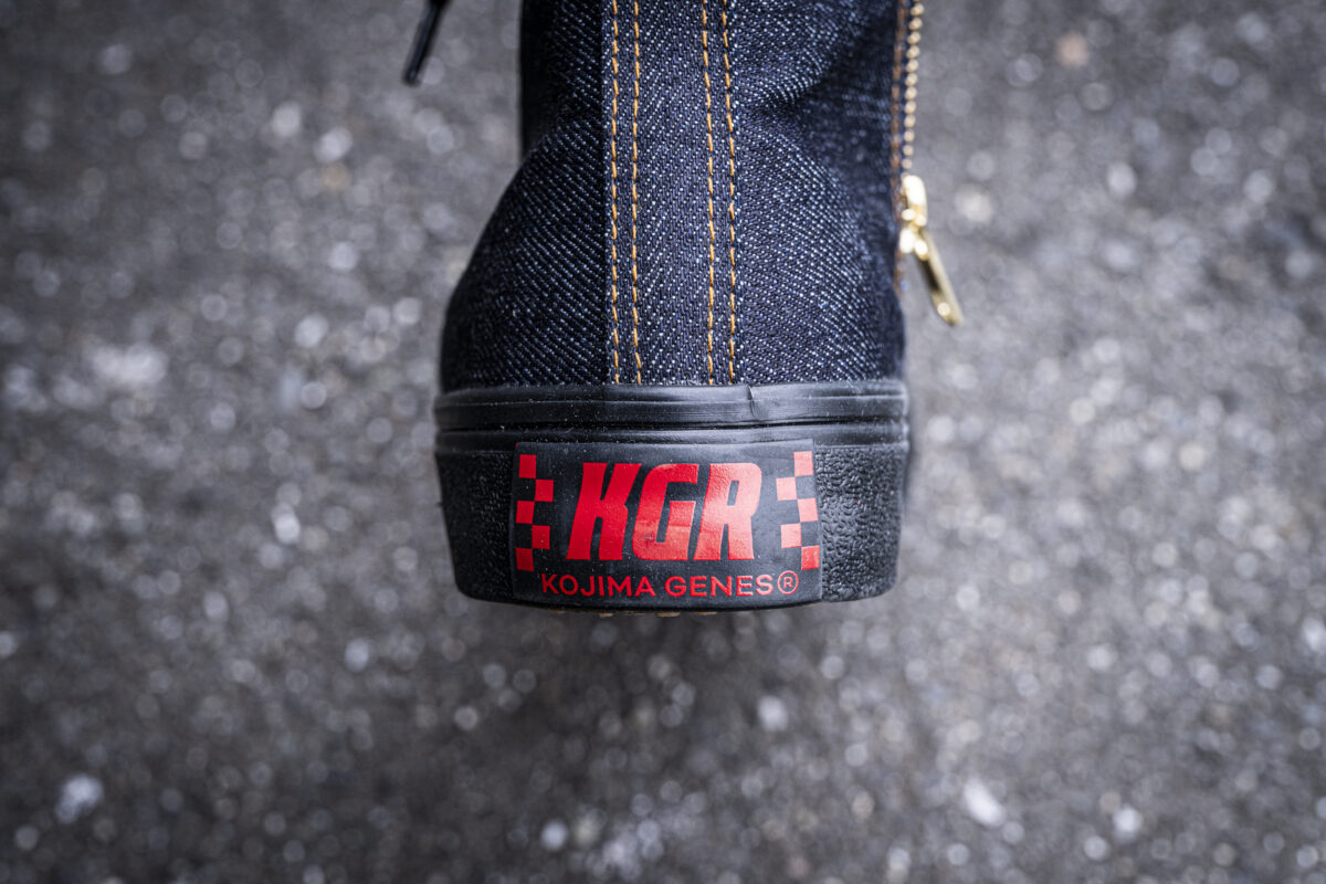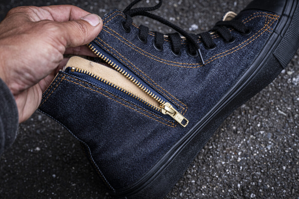 今回登場する「ハイパー V®︎ デニム スニーカー」は、児島ジーンズの新レーベル「KGR」から発売される待望の新作です。児島ジーンズが誇るオリジナルのデニムを使用するスニーカーは、クラシックなハイカットスタイルを採用しながら、内側にYKK製のジッパーを装備。シューレースを使用せずとも脱ぎ履きがしやすい作りとなっています。