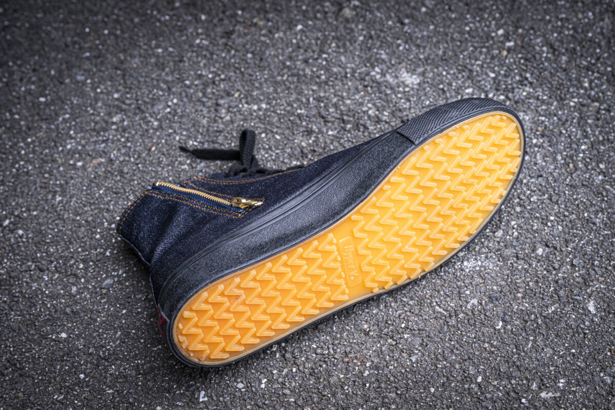 「ハイパー V®︎ デニム スニーカー」の最大の特徴のひとつがソール。「雨の日でも安心して履ける1足を」そんなコンセプトで制作されたスニーカーは、岡山県の日進ゴム株式会社と共同開発したものです。創業100年を数える同社は、建築現場などで使用される地下足袋を長年販売してきました。建築現場の職人たちが愛用する地下足袋は、ソールにゴムを使用しており、この「ハイパー V®︎ デニム スニーカー」でも現場仕事で職人たちから絶大な支持を得てきた極めてグリップ力の高いソールを搭載しています。