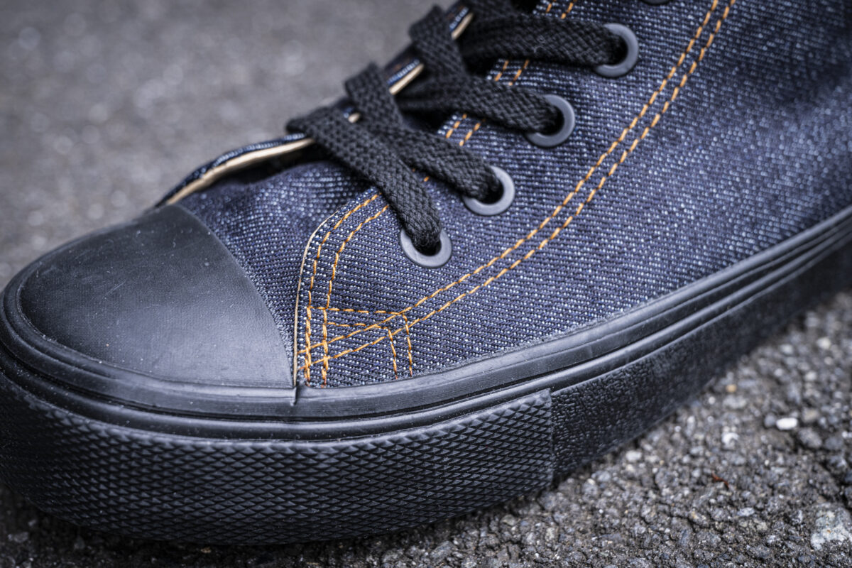 複数のパーツを組み合わせてスニーカーのアッパーを構成するつくりで、各パーツはもちろんジーンズ同様に縫製されています。アッパー各部やジッパーの周辺はストレスがかかることもあり、ダブルステッチで縫い込まれています。そんなブルーデニムに映える金茶ステッチもまた「ハイパー V®︎ デニム スニーカー」のアクセントのひとつです。