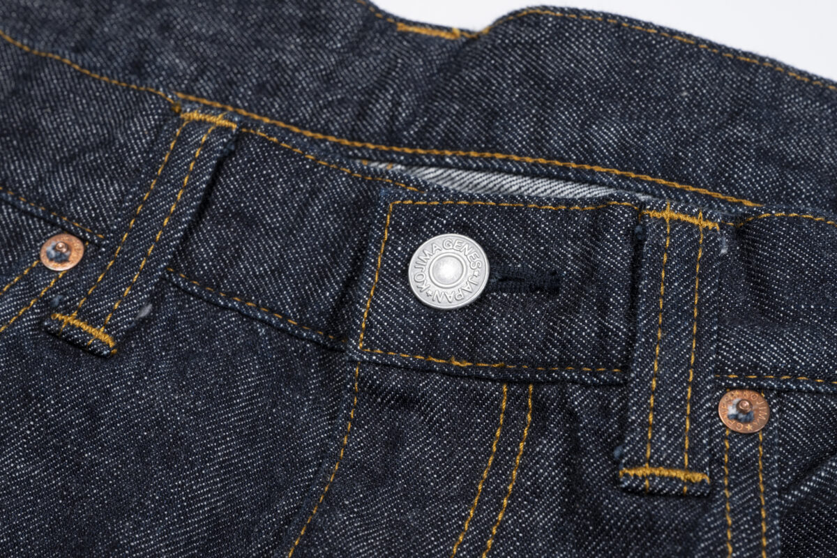 強度を重視した丹念な縫製はもちろんこのモデルでも。フロントのボタンやリベットはもちろん児島ジーンズのオリジナルです。