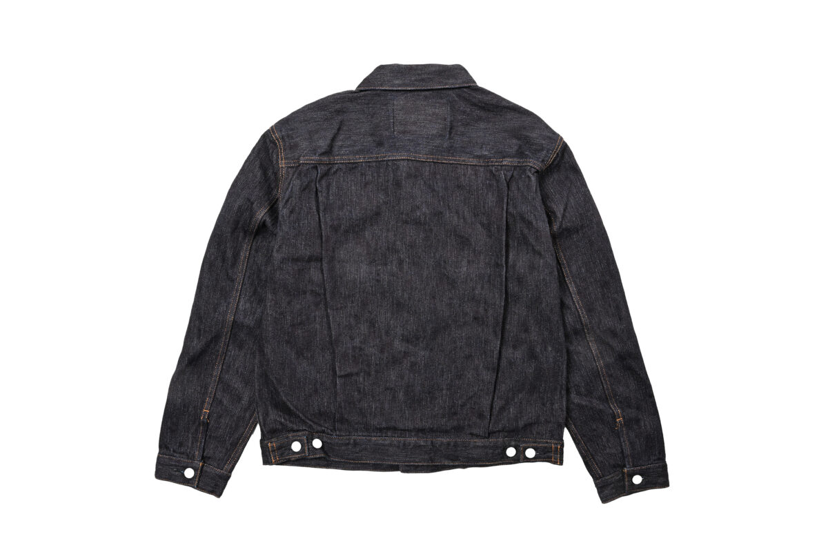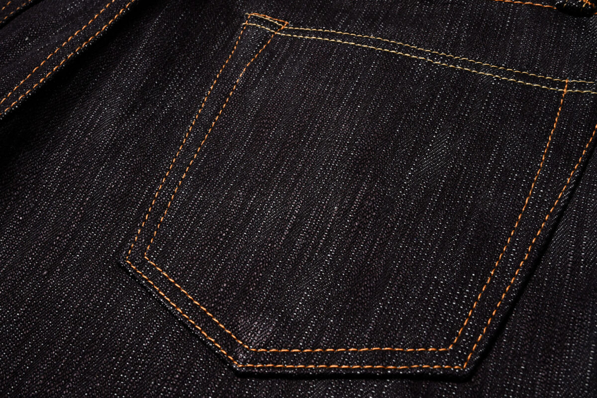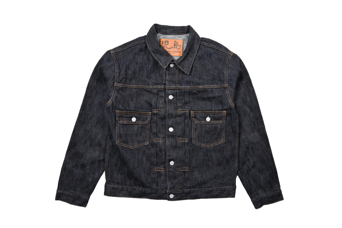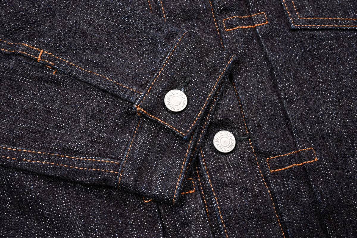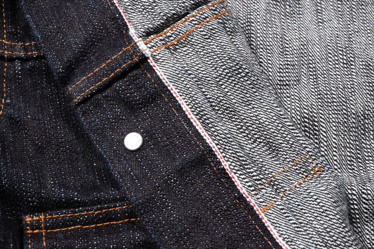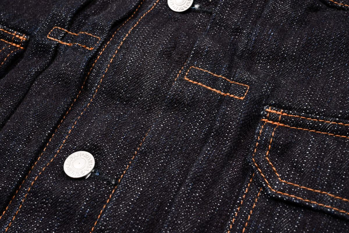 革パッチや耳付きセルビッチデニム、オリジナルのボタンやリベットなど見どころ満点の1着。独特の凹凸感にも注目。
