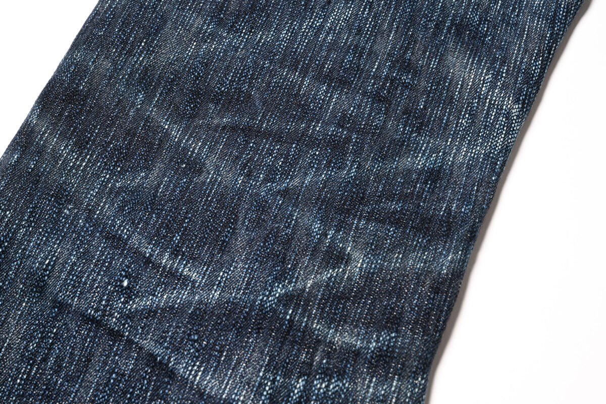 極太の5番手スラブ糸による凹凸や、時折あらわれる糸だまりによって劇的な色落ちを楽しむことができます。