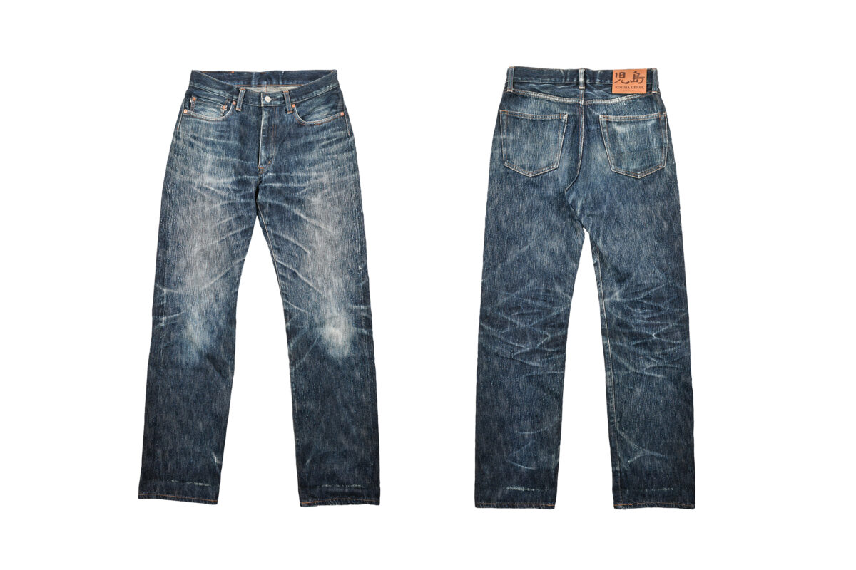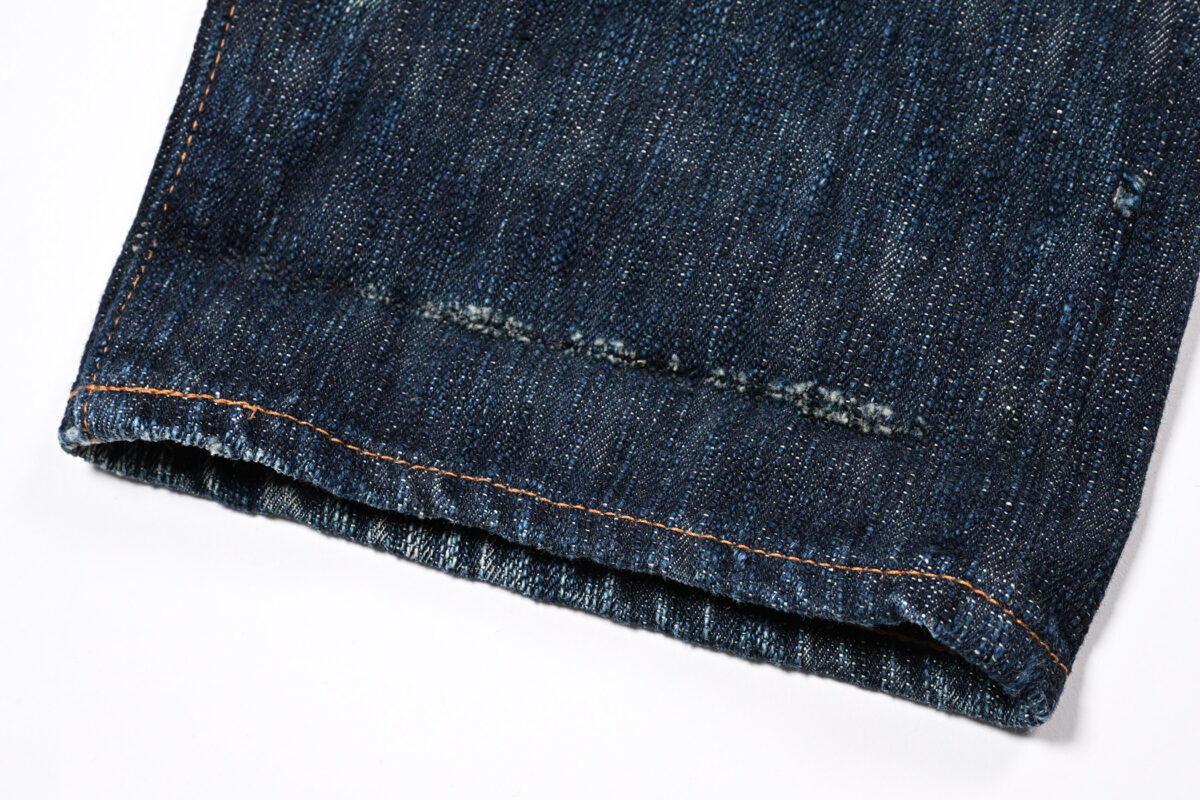 こちらはRNB-1000RZを1年ほどかけて穿きこんだ経年変化のサンプルです。ご覧ください、この色落ちを! デニムの濃淡はもちろん、スラブセルビッチデニムならではの凹凸感が生み出す色落ちは、局所的に見れば不均一のようにも思えますが、全体的に見るととても美しい。適度な洗濯によって清潔感も保たれていることも色落ちが映える理由のひとつです。