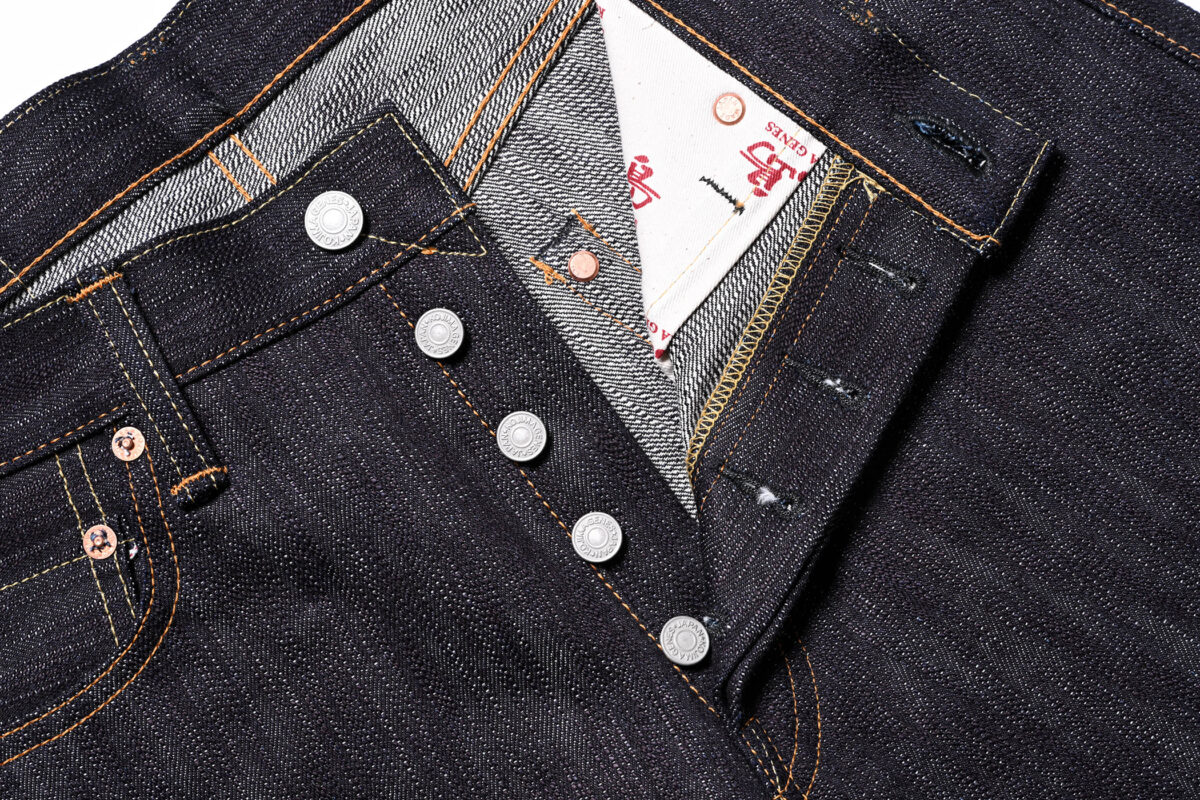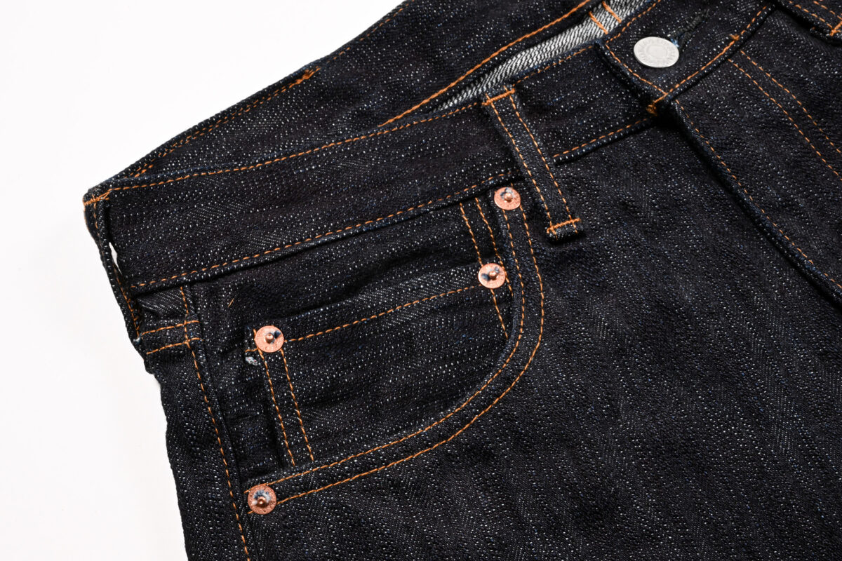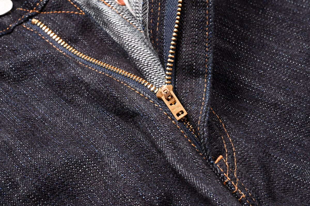 腰まわりや太もものワタリはスッキリとしていますが、スリムフィットほど細くはないので、適度なリラックス感も味わえます。太ももから裾にかけてはほぼストレートなシルエットなので、流行にも左右されずに長く愛せる1本となるでしょう。革パッチをはじめ、銅リベット、スレーキ、セルビッチなどヴィンテージデニムの王道のディテールはすべて備えています。フロントはZipフライです。