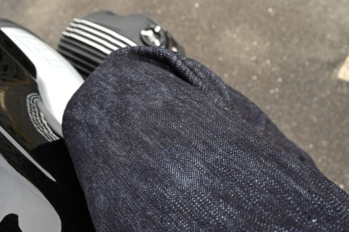 例えば、バイパスや有料道路など平均速度の高い道路を走る場合、前走車が巻き上げる小さな砂粒が膝下から足首にかけて飛んでくることがありますが、チノパンなどオンスの小さな薄手の生地の場合は飛んでくる砂粒に痛みを感じることもあります。一度でもそんな経験をしたことがある方なら、ボトムスの厚みには気を遣っていることでしょう。今回短時間ではありますが、高速道路を走った印象では19オンス・スラブセルビッチデニムは、レザーパンツに匹敵するとは言わないまでも、相当な安心感がありました。
