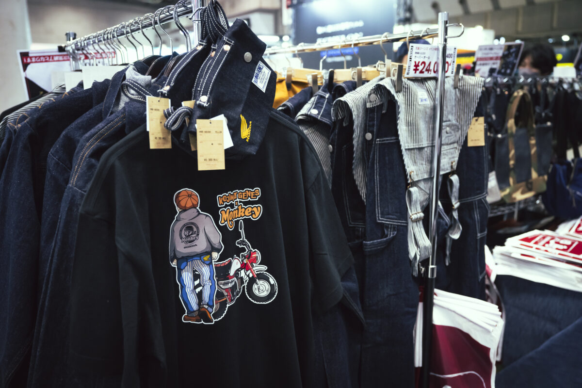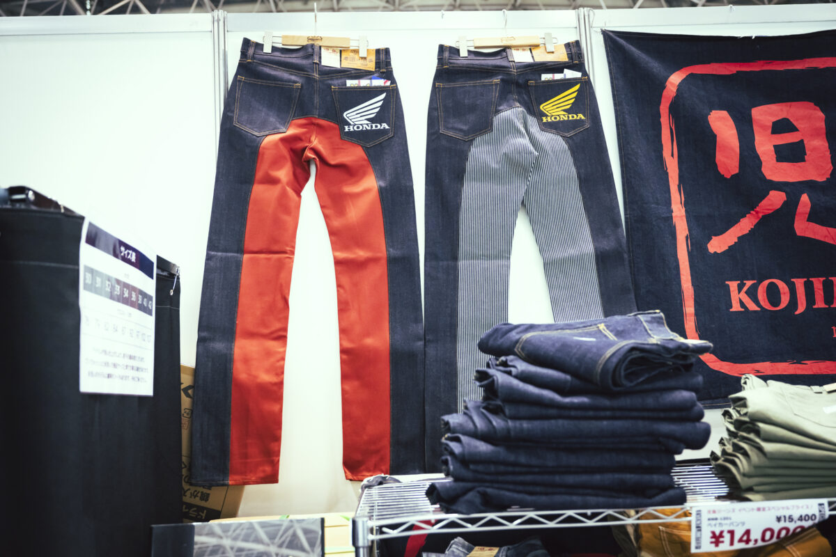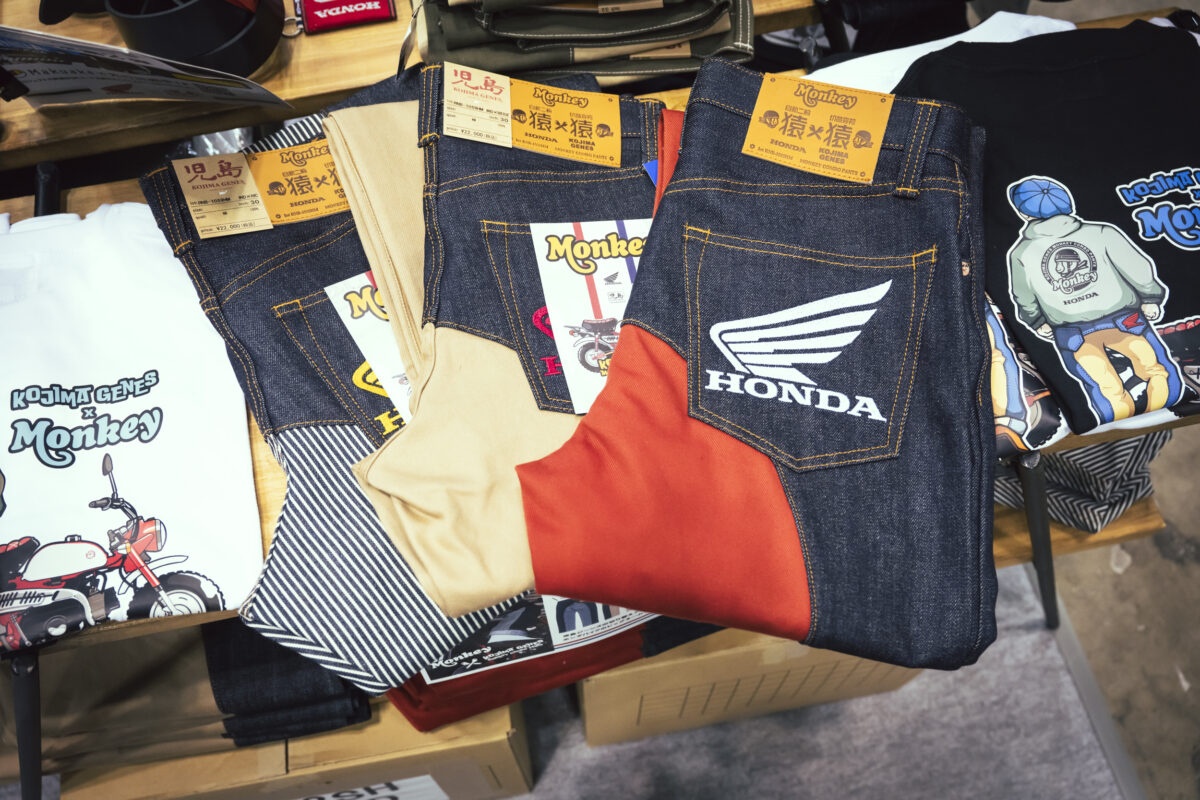 ブースの中央には近年話題を振りまくホンダとのコラボレーションアイテムを展示。写真中央に展示しているのは、ホンダ×児島ジーンズの人気シリーズ、モンキーコンボパンツです。