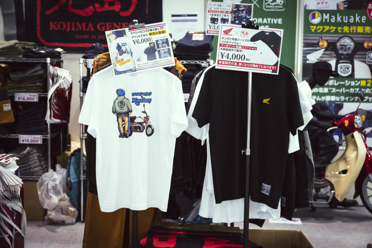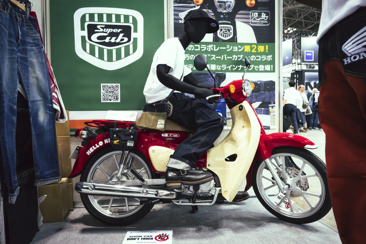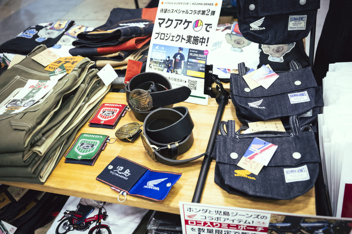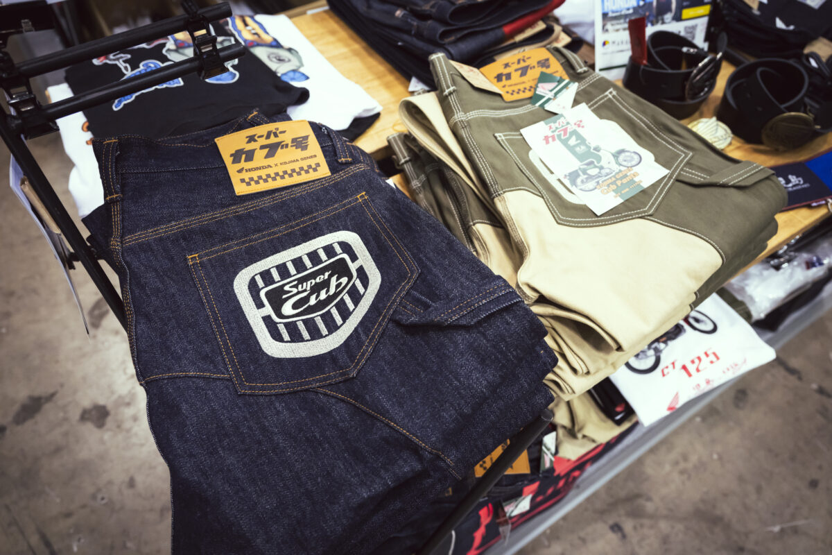 ブースにはもちろん、ホンダと児島ジーンズの最新コラボアイテムも展示。第二弾となるカブパンツは、スーパーカブ110の実車も展示してコラボアイテムの世界観を演出していました。