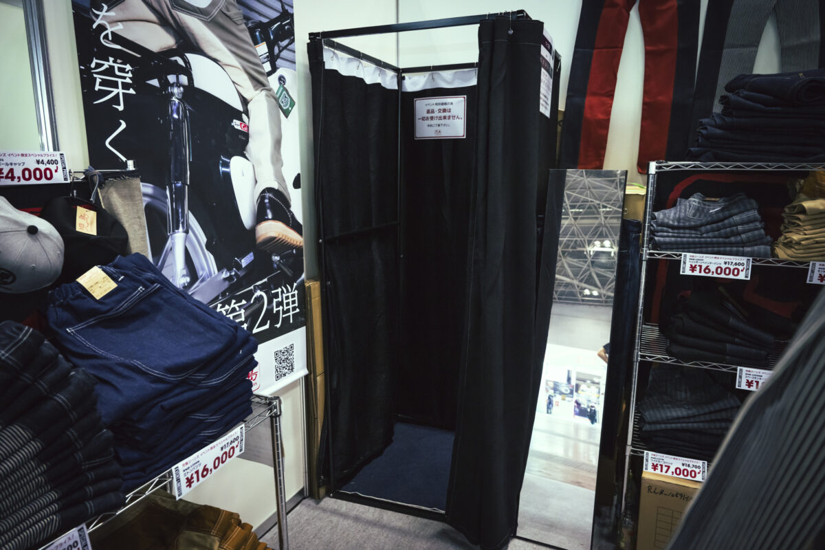 じつはブース内には試着室も用意! 実際にスタッフのアドバイスを得て、デニムパンツに足を通す来場者も。サイズ感や質感などを確かめるにはやっぱり試着がいちばん。特にスタッフが常駐するブースで試着できるのはうれしいですよね。今回立ち寄れなかった……という方はぜひ次回にチャレンジ!