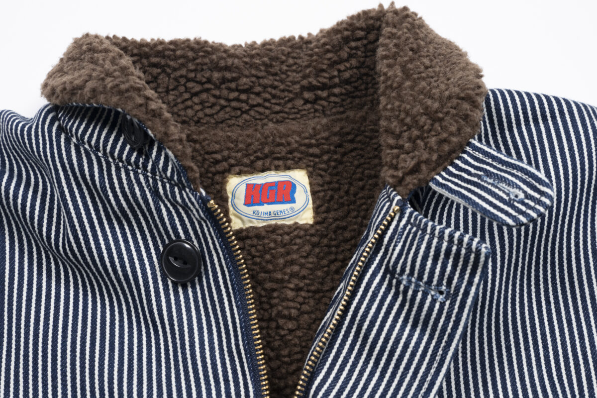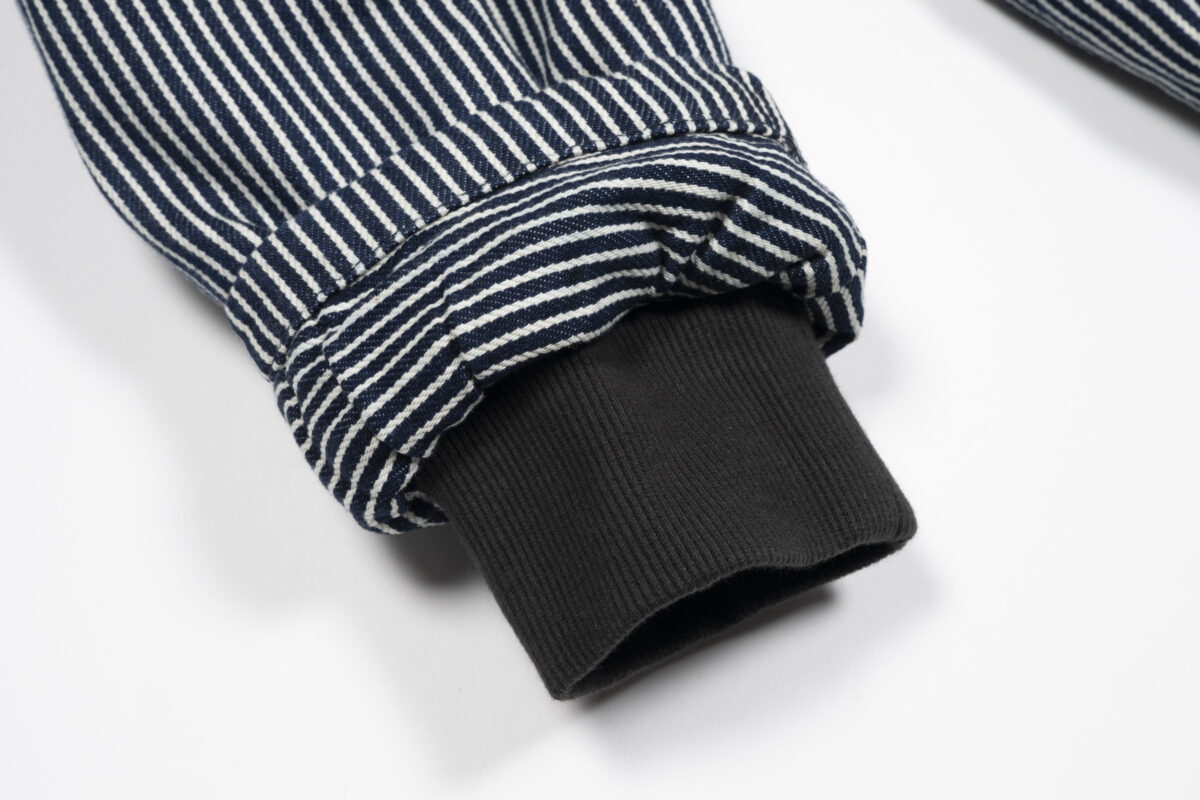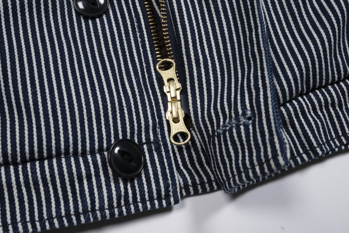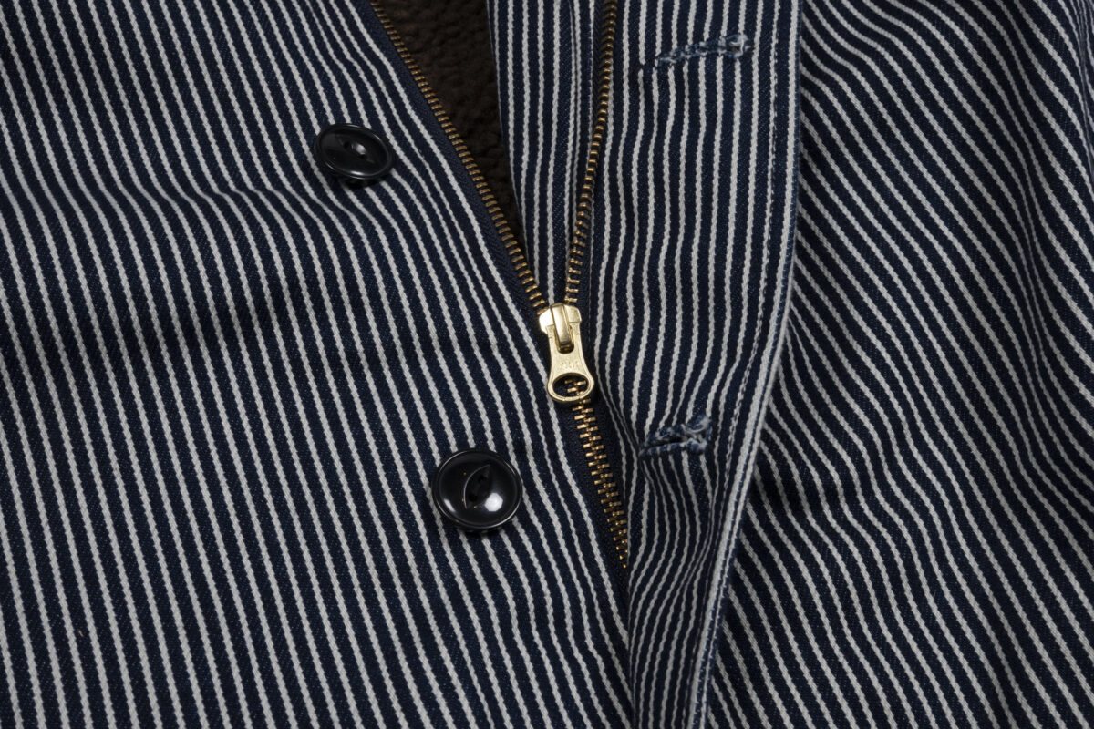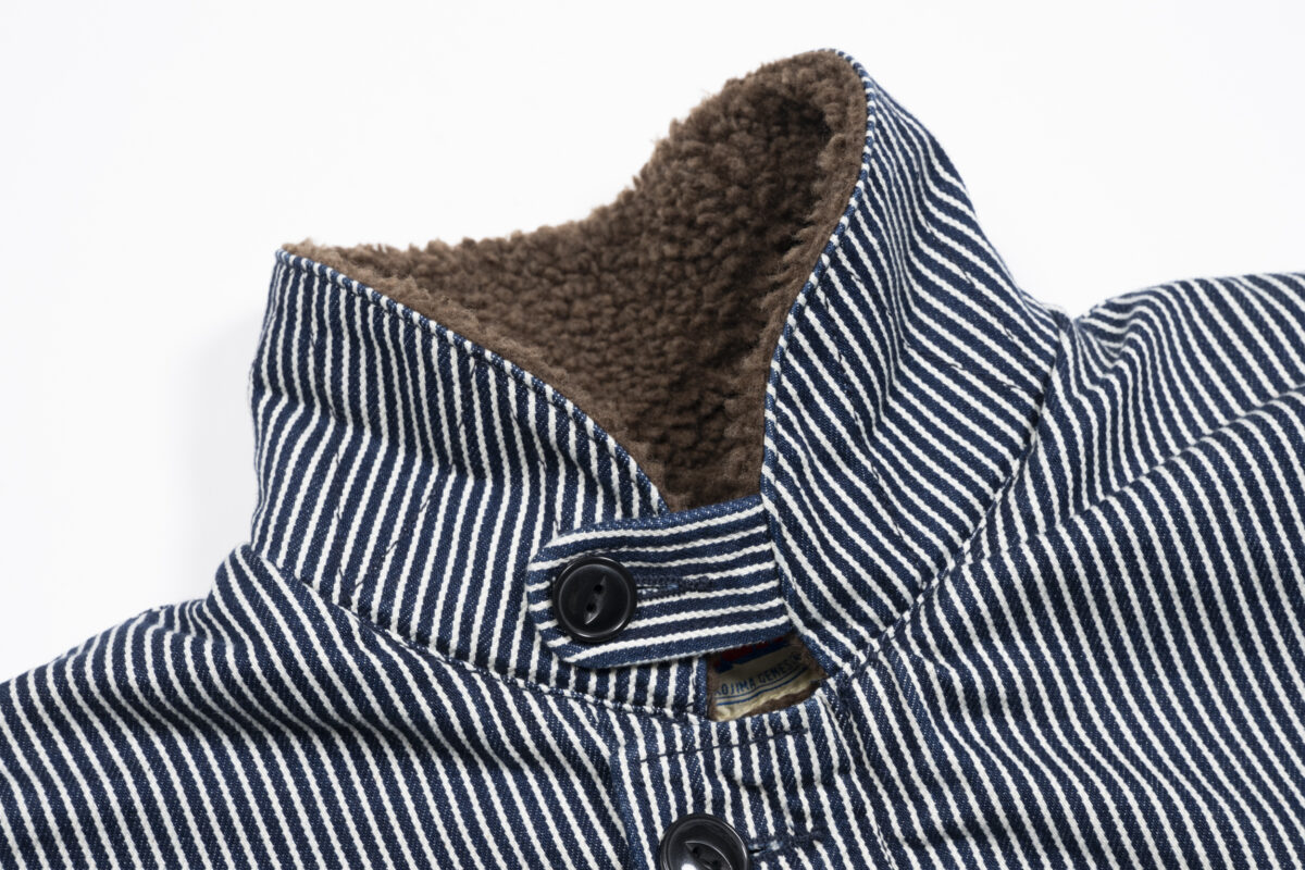 細いストライプが縦に入ったヒッコリー柄はワークウエアでもお馴染みの生地ですね。ただ、N-1デッキジャケットにヒッコリーを使うという発想が児島ジーンズらしいアプローチと言えるでしょう。