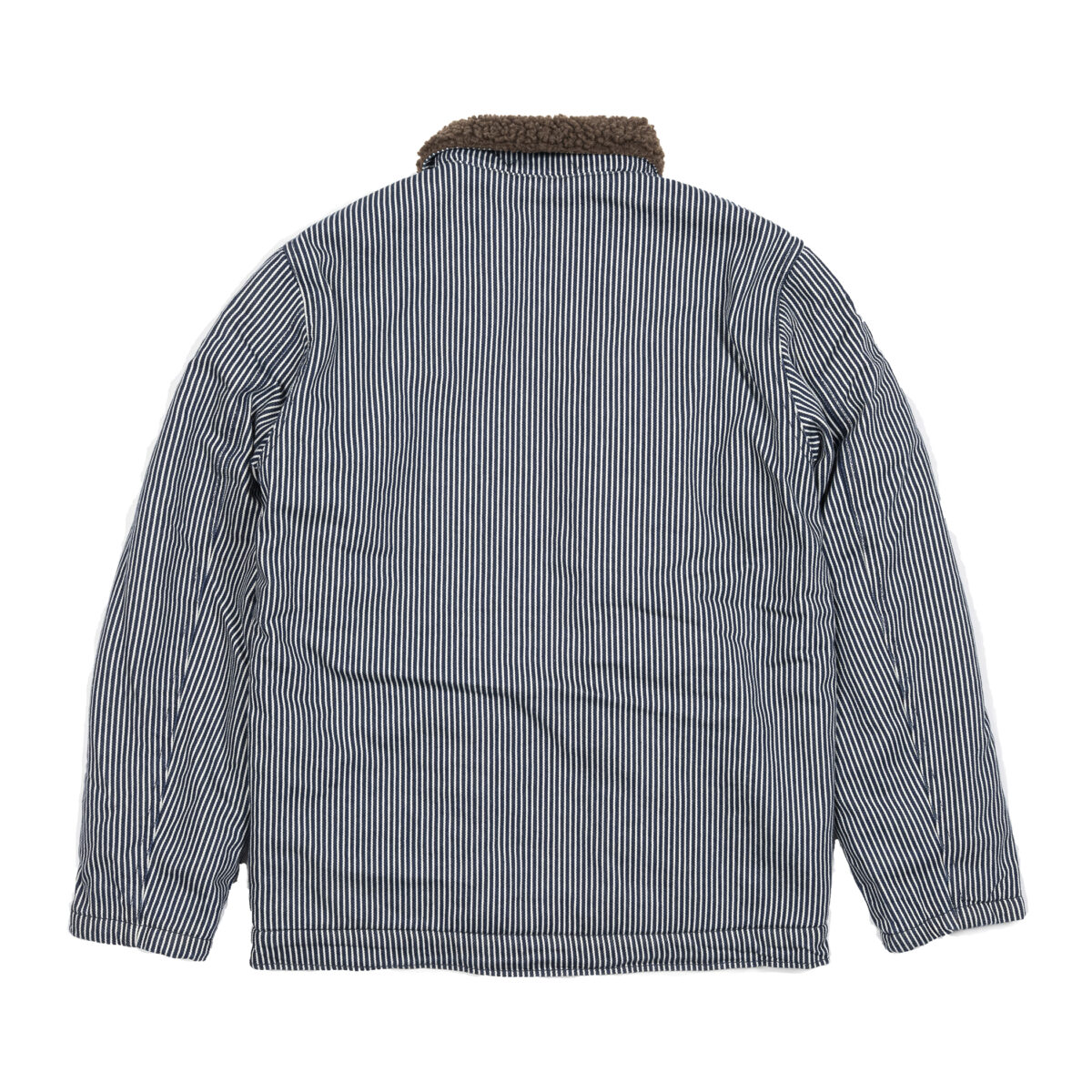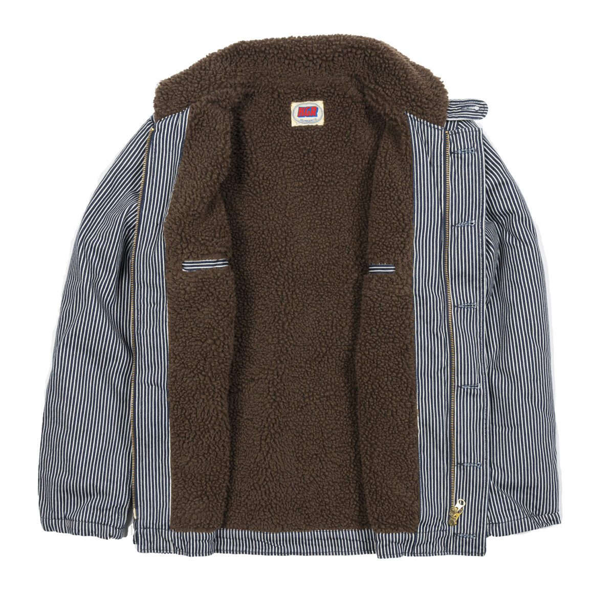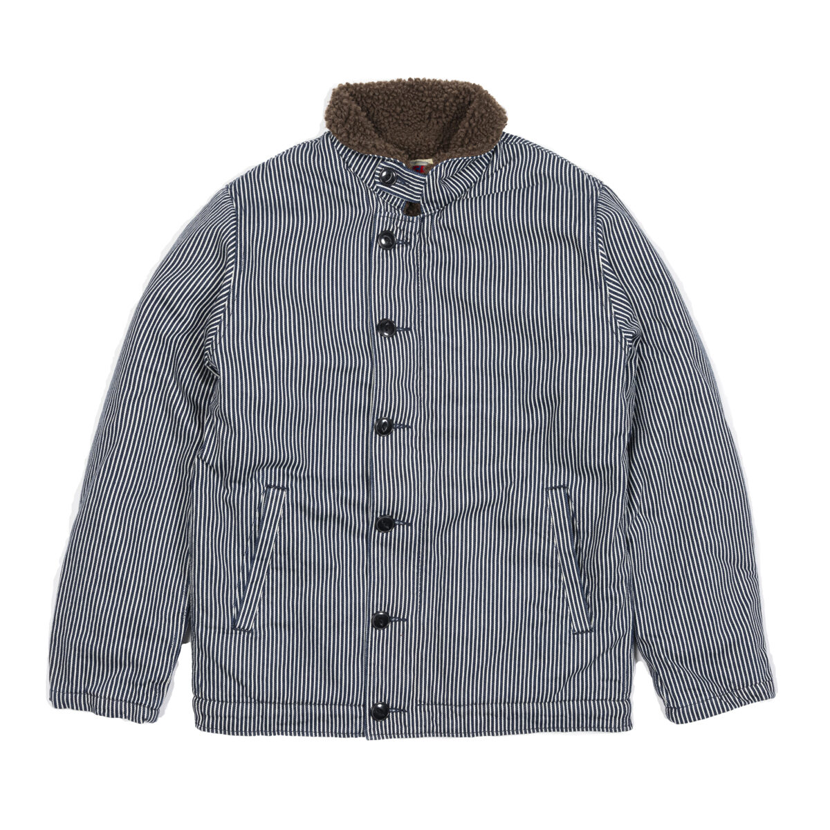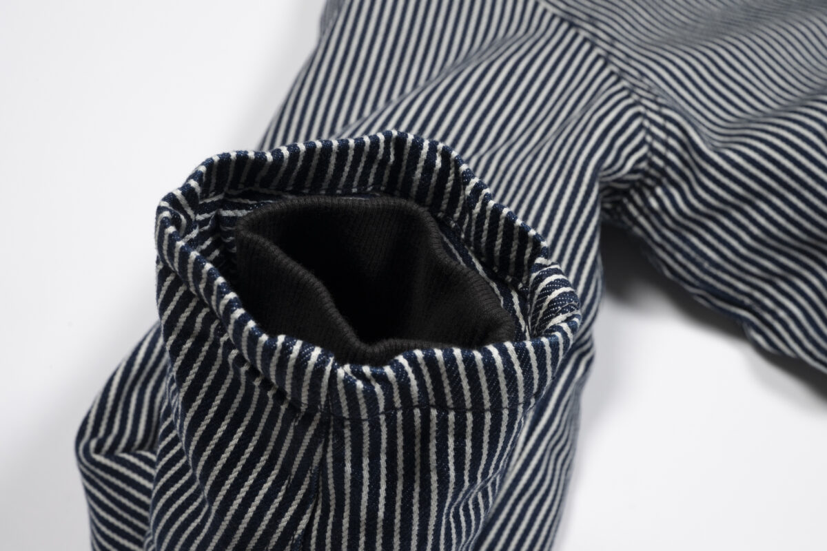 細いストライプが縦に入ったヒッコリー柄はワークウエアでもお馴染みの生地ですね。ただ、N-1デッキジャケットにヒッコリーを使うという発想が児島ジーンズらしいアプローチと言えるでしょう。